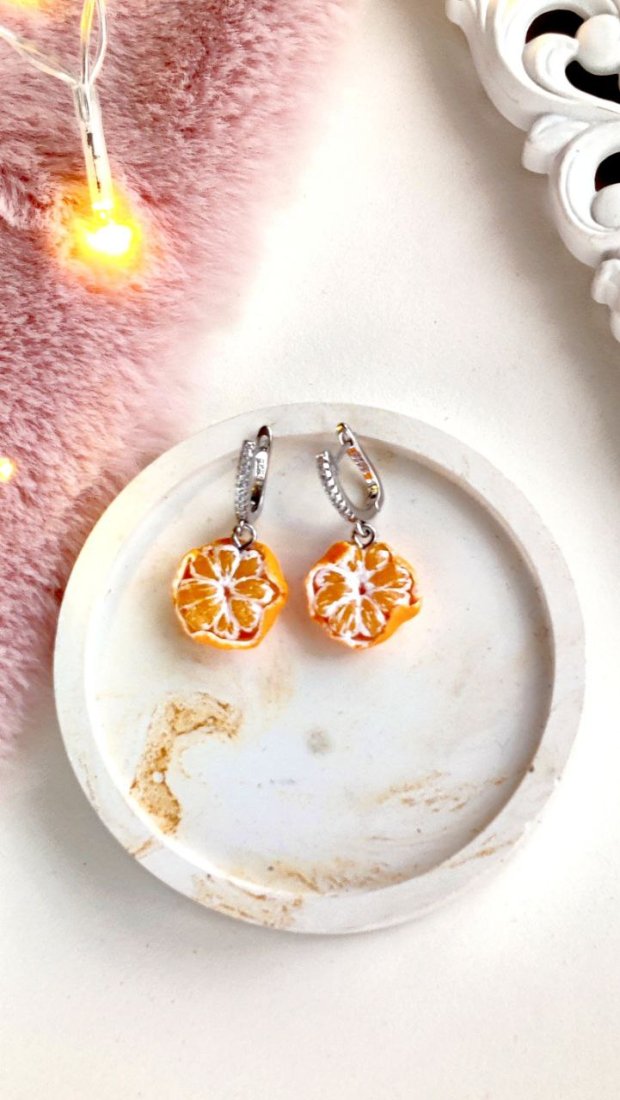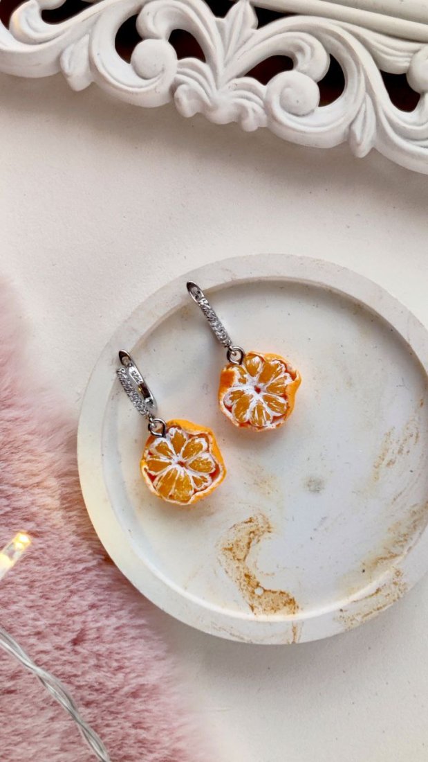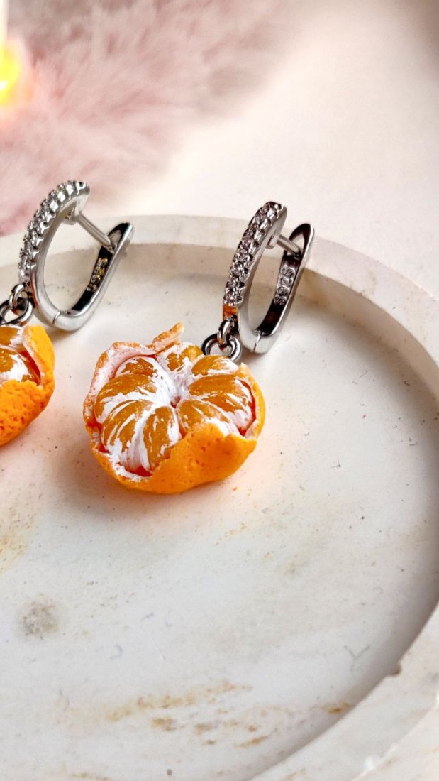 Kolczyki wyglądają jak prawdziwe mandarynki: soczyste, świeże i pełne detali. Idealnie sprawdzą się jako oryginalny dodatek do zimowych i świątecznych stylizacji, ale także jako niebanalny prezent dla miłośniczek rękodzieła i wyjątkowej biżuterii.