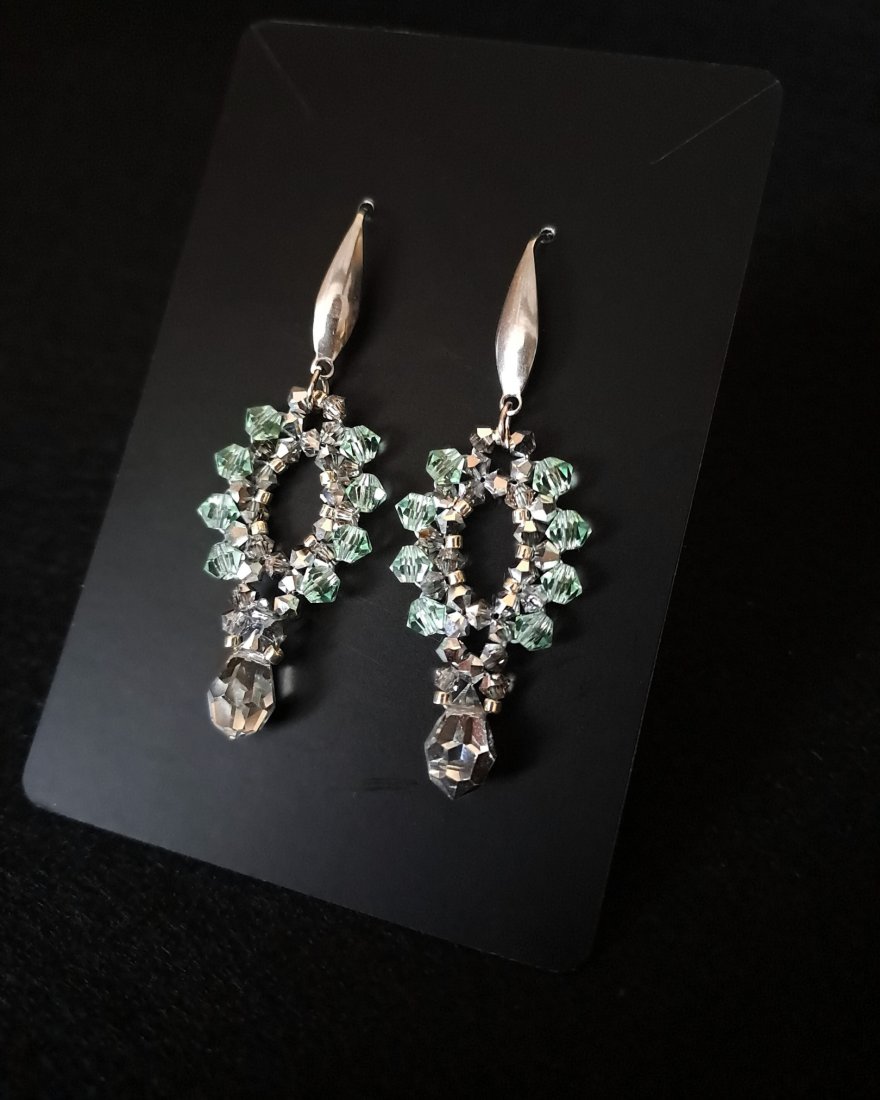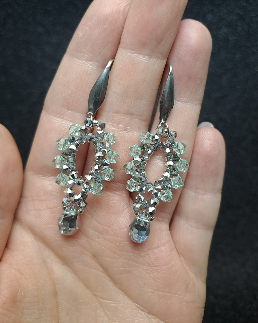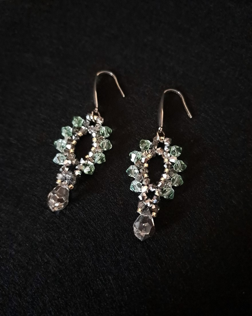 Tworzone ręcznie z kryształków Preciosa Bicone: miękkiej mięty Chrysolite (4 mm) i metalicznego Labrador half (3 mm). Całość przepleciona srebrnymi koralikami Miyuki Delica, znanymi z doskonałej regularności i subtelnego połysku.