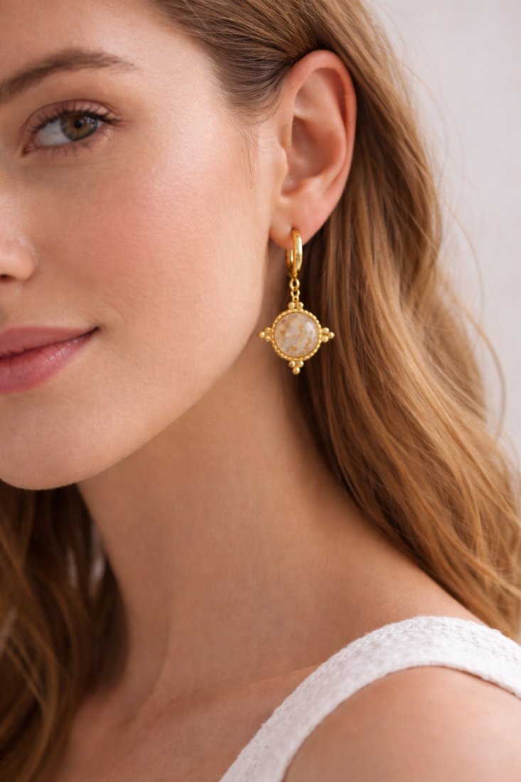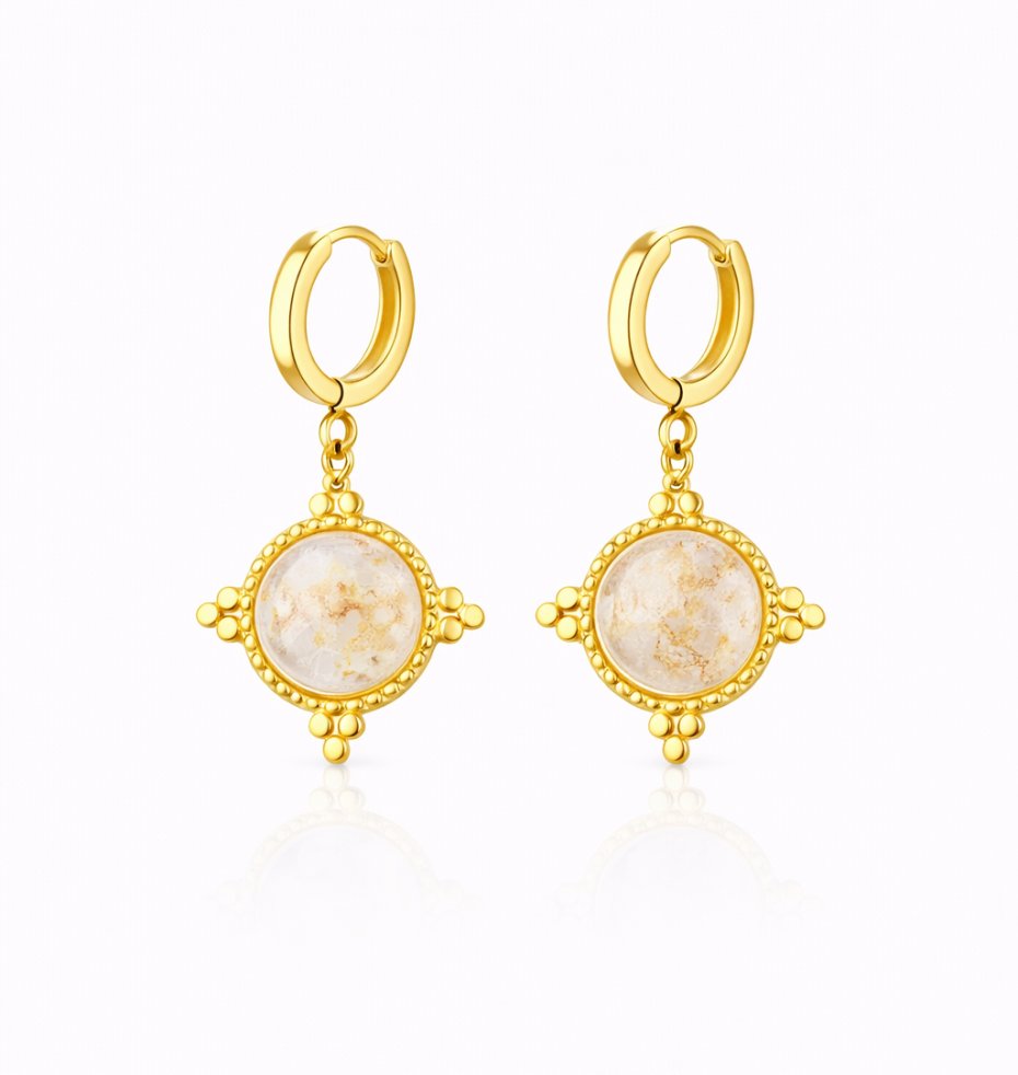 Efektowne kolczyki zapinane na bigiel angielski, wykonane ze srebra próby 925 pokrytego 24K złotem (bigle), stali chirurgicznej oraz kryształu górskiego.