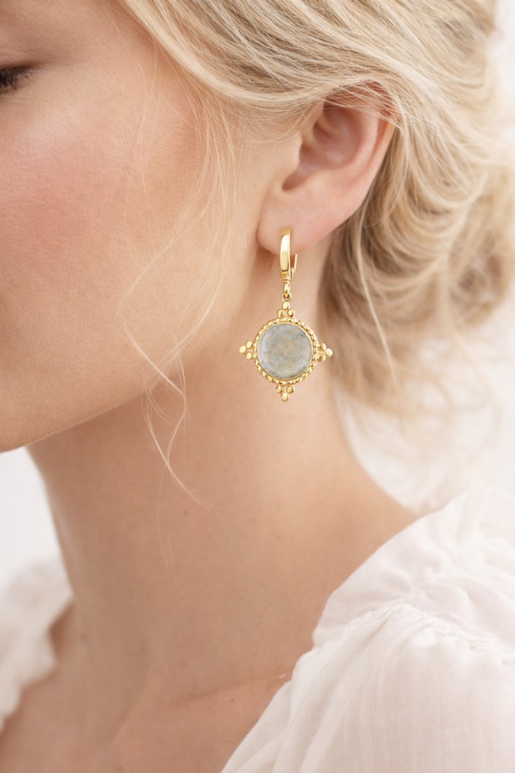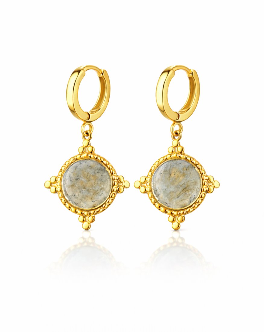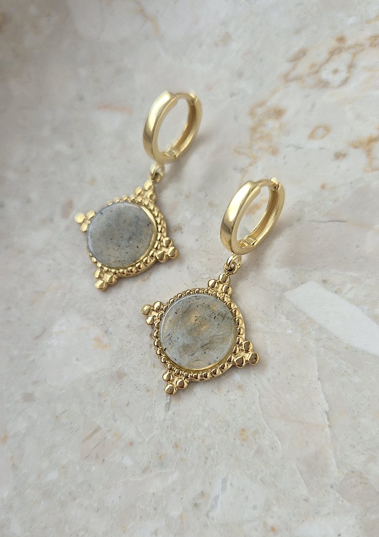 Efektowne kolczyki zapinane na bigiel angielski, wykonane ze srebra próby 925 pokrytego 24K złotem (bigle), stali chirurgicznej oraz labradorytu.