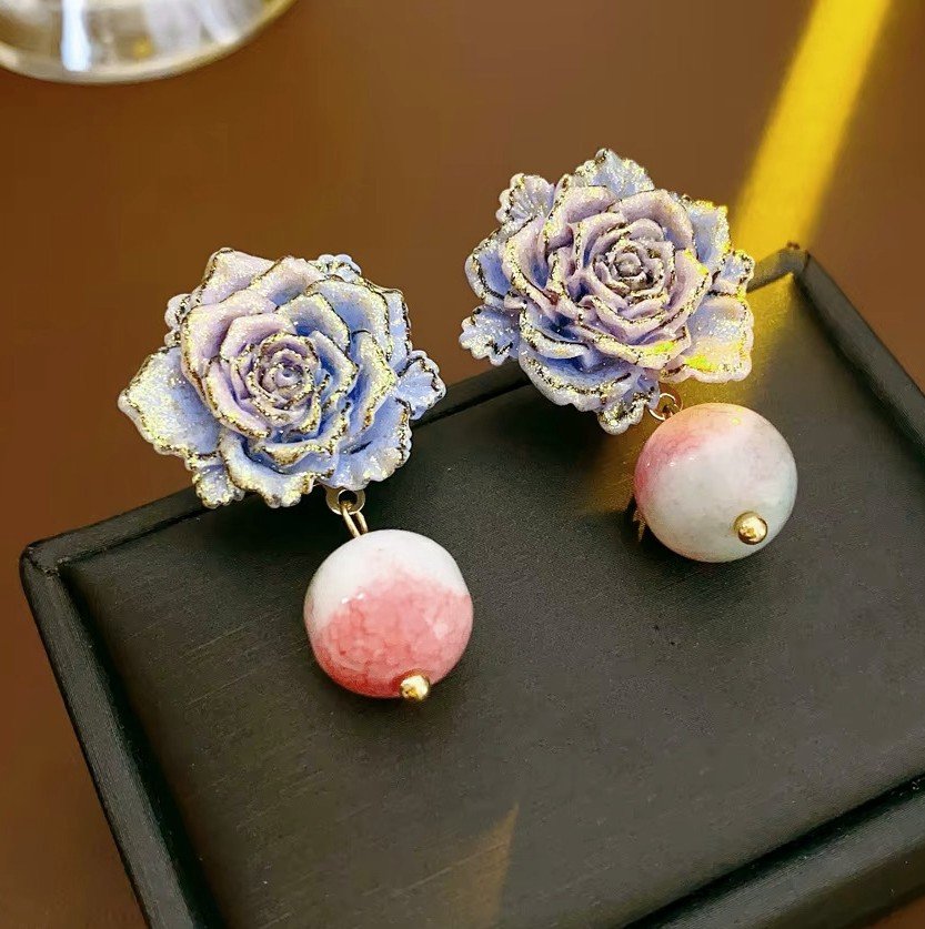 K7037 Piękne kolczyki róże na sztyftach z wiszącym kamieniem.