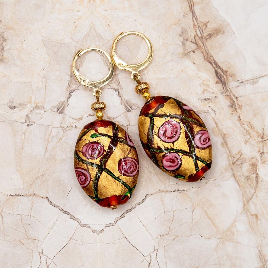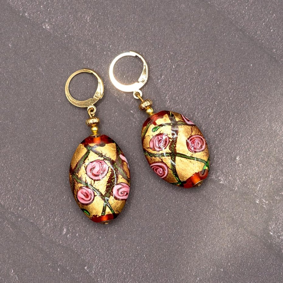 Kolczyki ze szkłem weneckim i elementami metalowymi w kolorze złotym. Bigle stalowe, zamykane. Długość całkowita -5 cm, szerokość -1,8 cm.