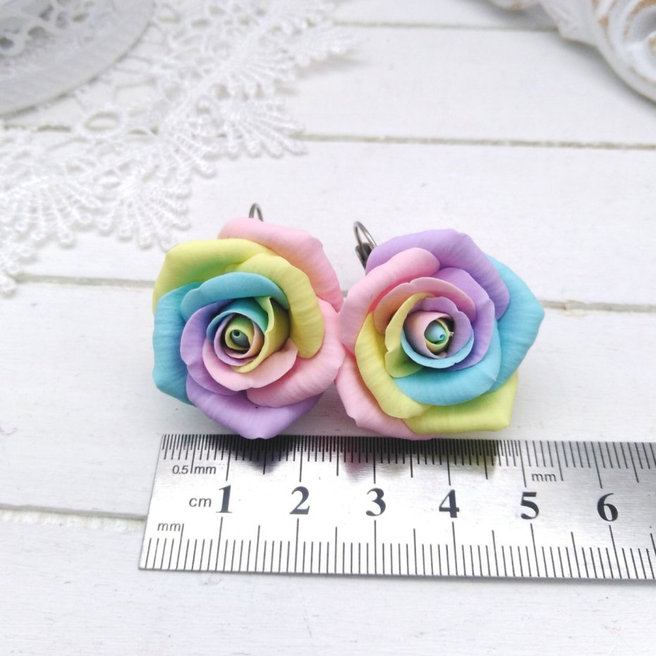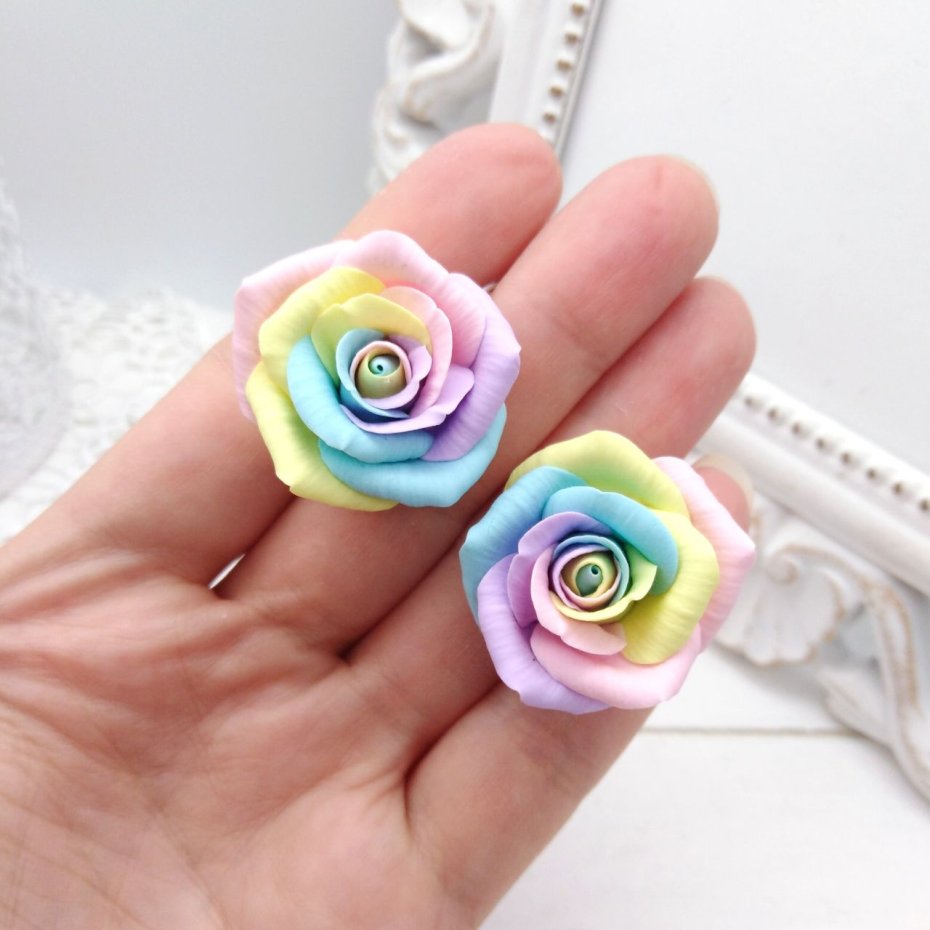 Unikatowe kolczyki w kształcie róż ???? w pastelowych, tęczowych kolorach – lekkie, romantyczne i niezwykle kobiece. Wykonane ręcznie z wysokiej jakości polimerowej gliny, malowane i cieniowane pastelami. Każdy egzemplarz jest wyjątkowy i niepowtarzalny.