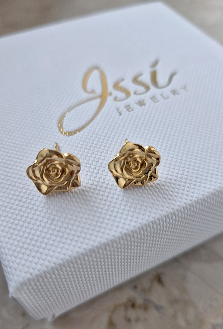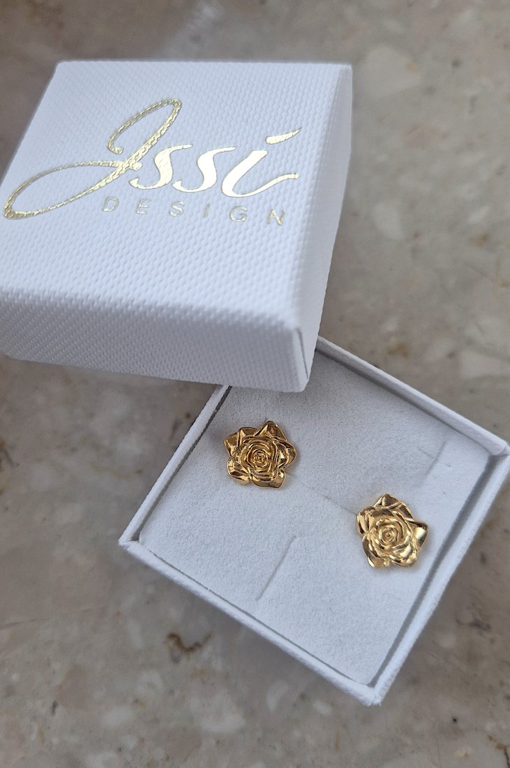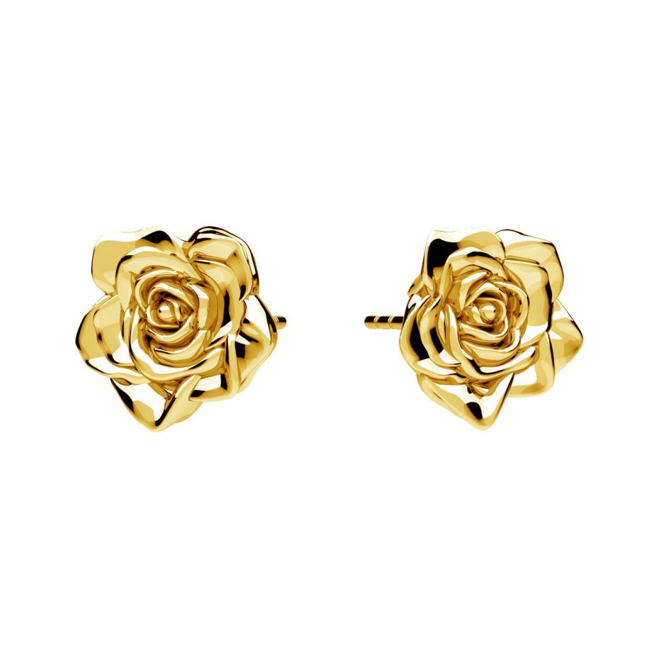Kolczyki w kształcie róż wykonane ze srebra 925 pokrytego 24-karatowym złotem. Zapinane na sztyft.