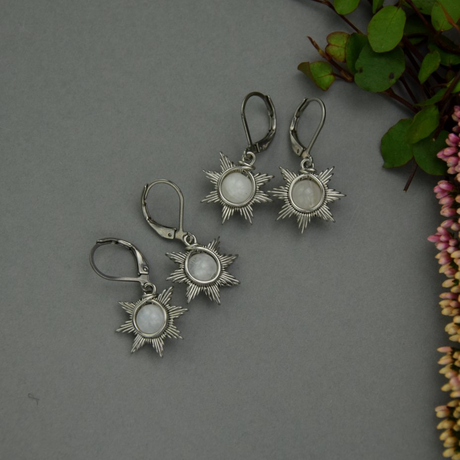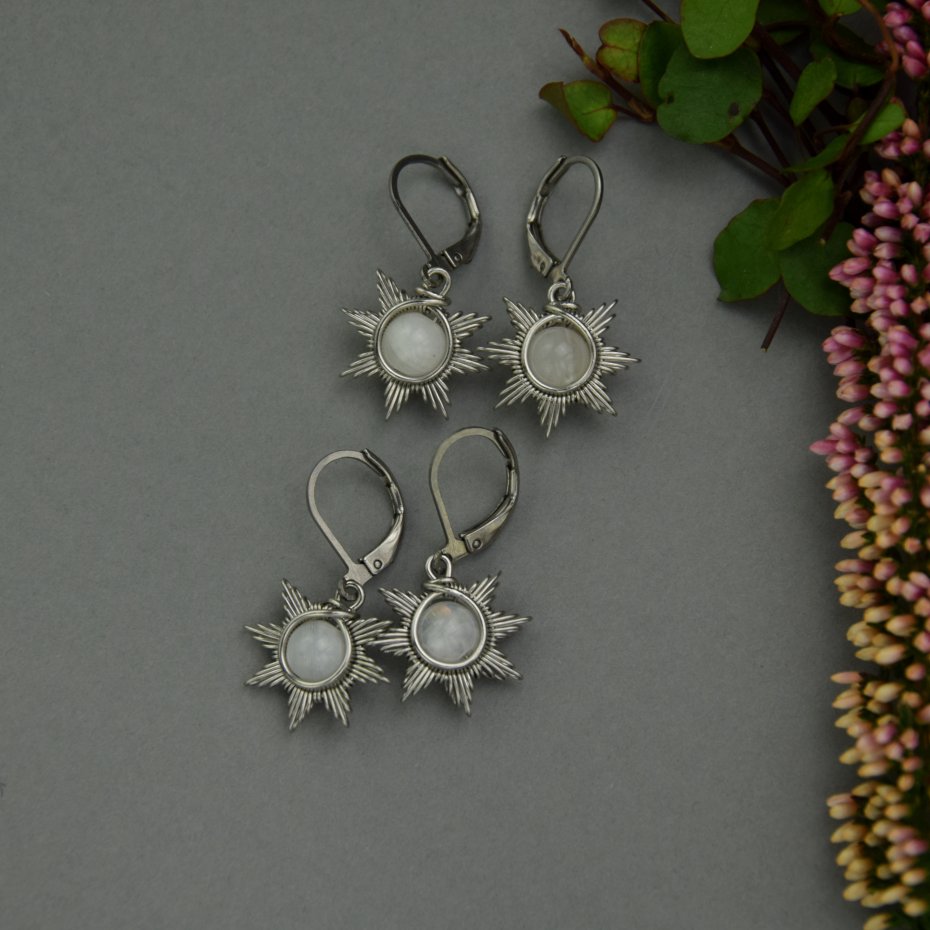 Małe kolczyki w kształcie słoneczek z kamieniami księżycowymi. Wykonane ręcznie techniką wire wrapping. W całości ze stali chirurgicznej. Ich długość całkowita (z biglami) to 3,2cm. Słońca mają średnicę około 1,8cm. Zdjęcia prezentują przykładowe kolczyki. Kamienie są naturalne i mogą się różnić delikatnie od tych przedstawionych na zdjęciach.