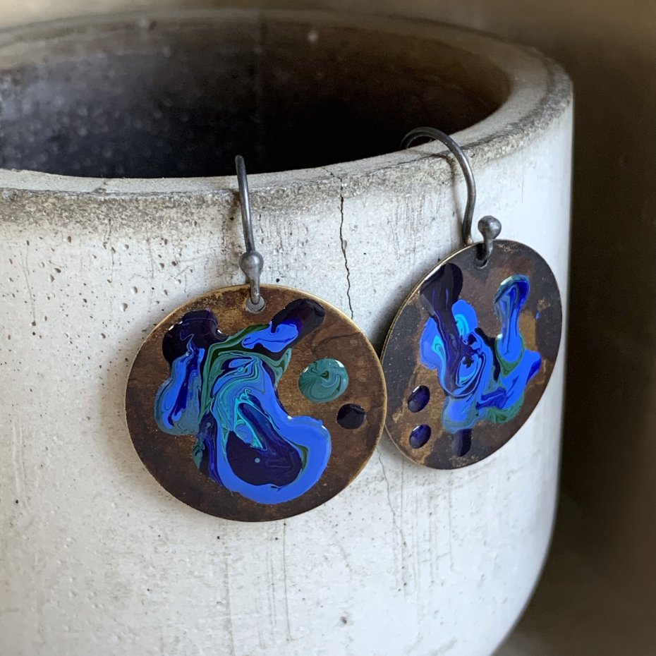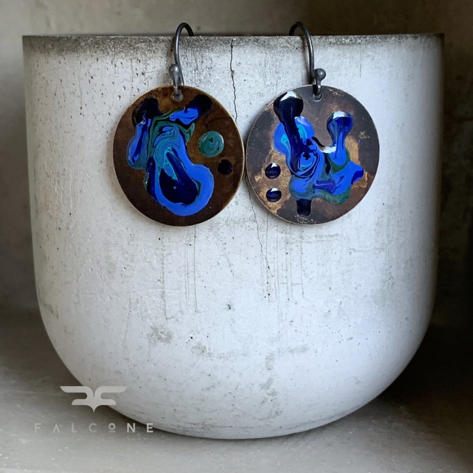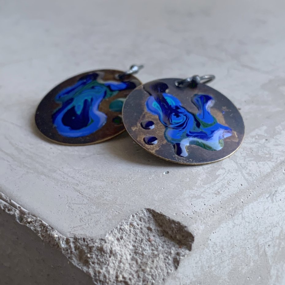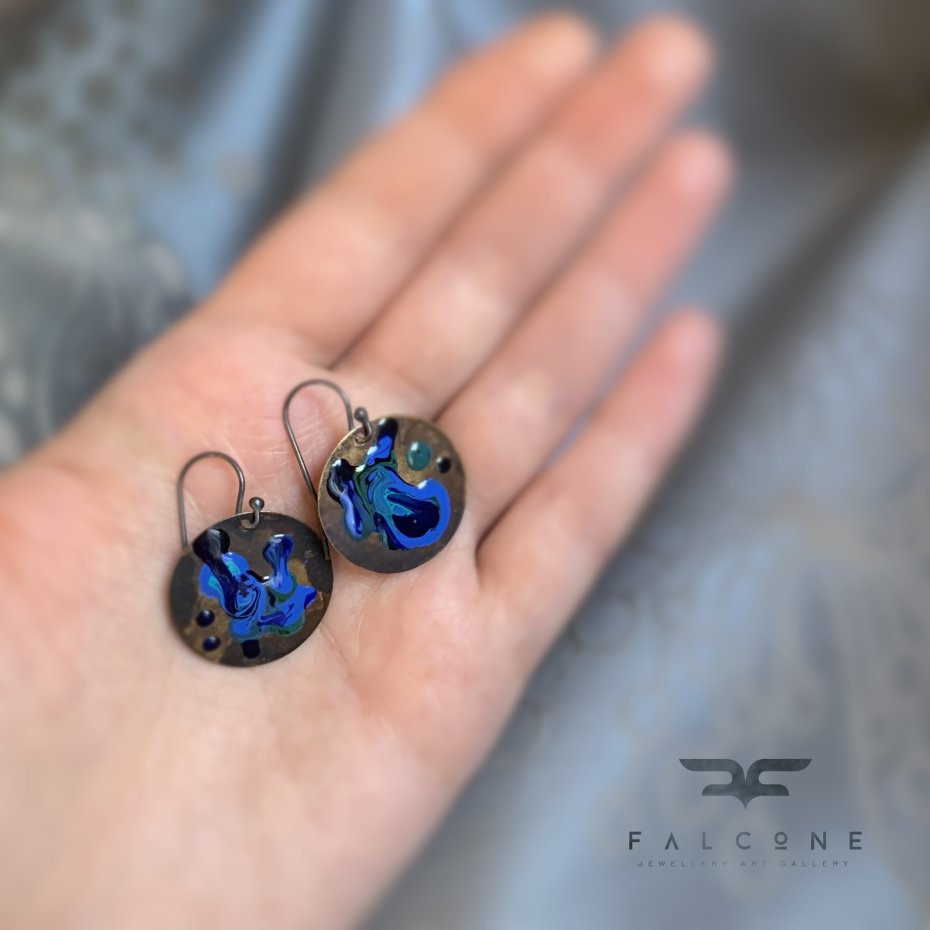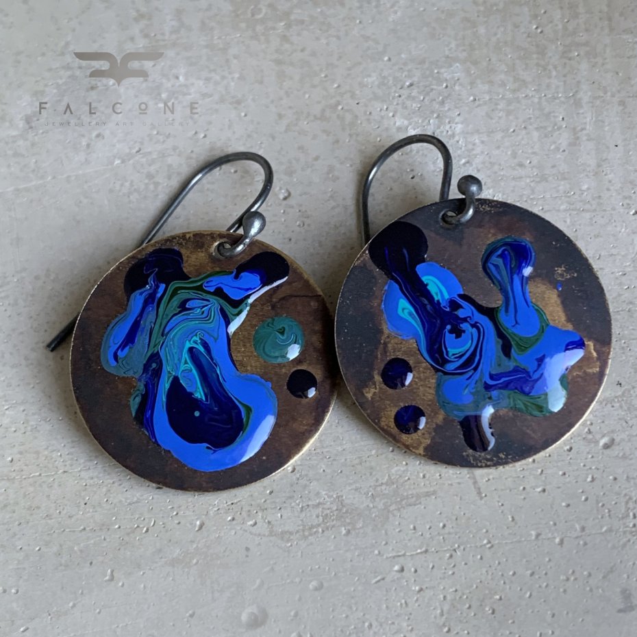 Kolczyki ze srebra i mosiądzu. Koła z patynowanego na brąz mosiądzu. Ręcznie ozdobione malowniczym motywem. Wzór inspirowany głębinami morskimi i stworzeniami zamieszkującymi głębiny podwodnego świata. Przenikające się barwy w tonacjach chłodnego błękitu przeplatającego się z ciemną zielenią z mocnym akcentem ciemnego granatu oddają niepokojącą aurę głębin. Kolczyki różnią się od siebie, każdy ma unikalne połączenie barw i kształtów. Kolczyki grają ze światłem, zmieniając się w zależności od jego natężenia. Średnica kół to ok. 2,3 cm. Bigle otwarte ze srebra 925. Długość kolczyków to ok. 3,5 cm.