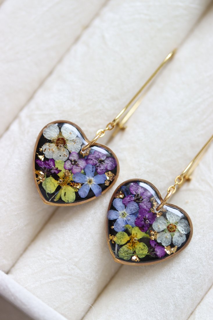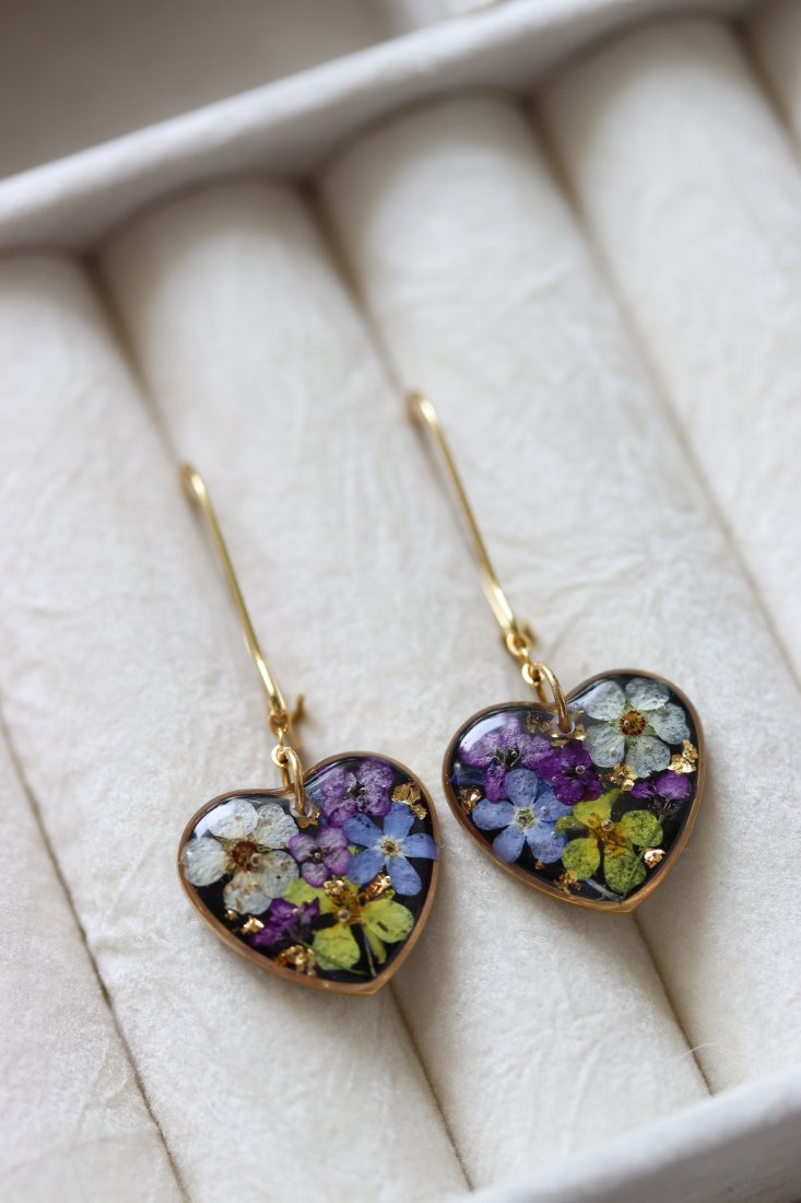 Wyrafinowane kolczyki w kształcie serca z kompozycją prawdziwych, ręcznie suszonych kwiatów, wśród których znajduje się delikatna niezapominajka – symbol pamięci i wyjątkowych emocji. Zatopione w krystalicznej żywicy na głębokim, ciemnym tle tworzą efekt botanicznej kompozycji skąpanej w nocnym świetle.