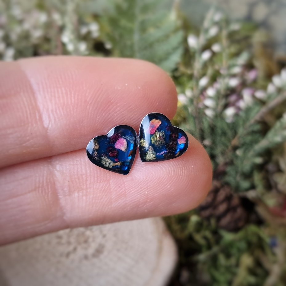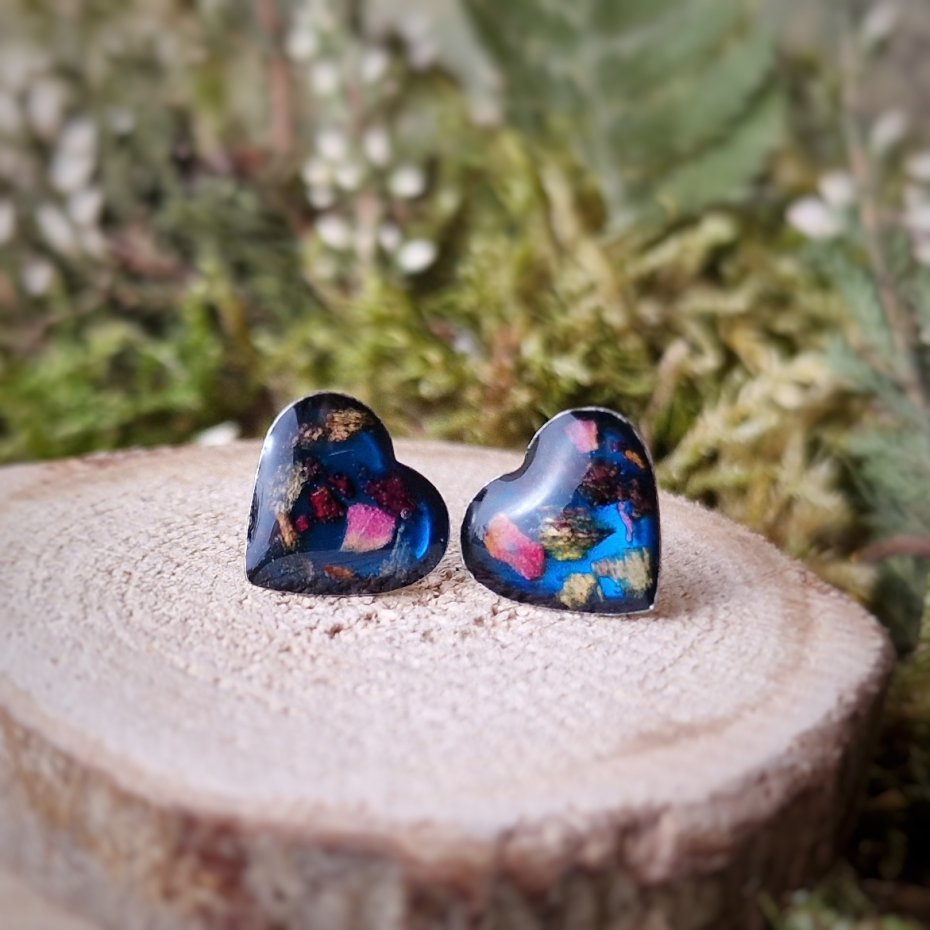 Kwiaty ususzyłam i zatrzymałam w żywicy jubilerskiej epoksydowej z dodatkiem barwników, pigmentów przeznaczonych do biżuterii.