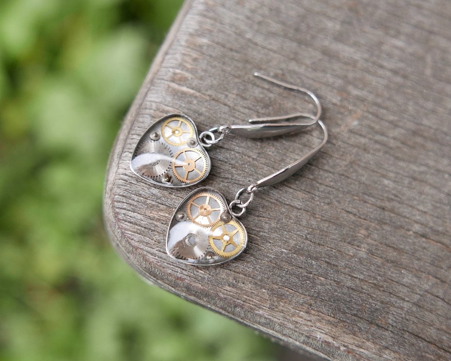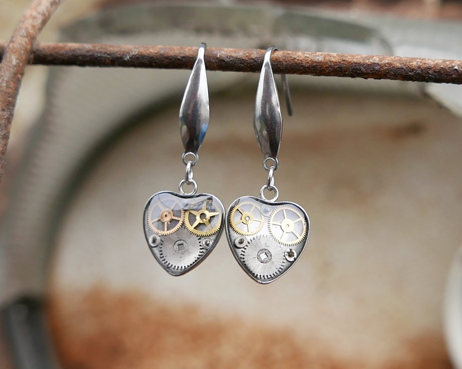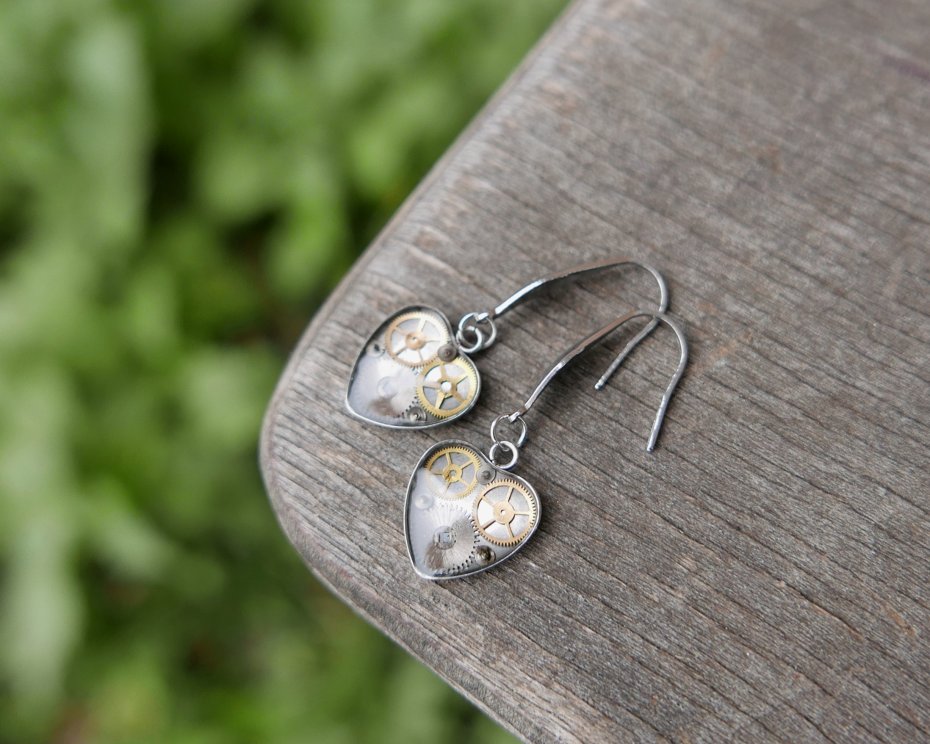 Kolczyki z metalu, z miniaturowymi częściami zegarka pod żywicą epoksydową.