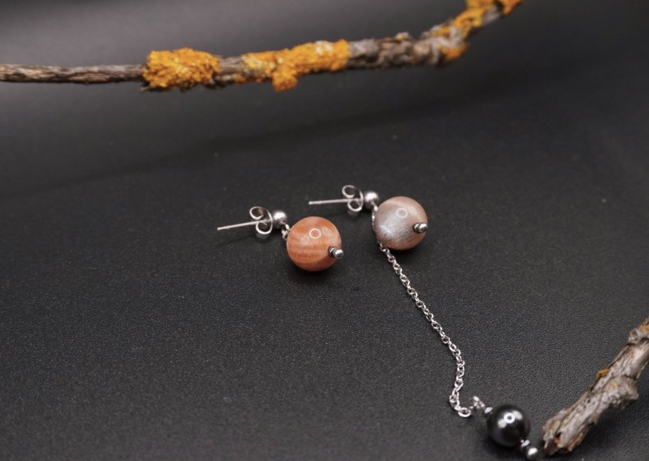 Lekkie i wyraziste kolczyki o nowoczesnym charakterze. Ciepły blask kamienia słonecznego dodaje światła, a delikatna asymetria z łańcuszkiem i ruchomym hematytem wprowadza subtelną dynamikę. Idealne jako akcent do minimalistycznych i warstwowych stylizacji.