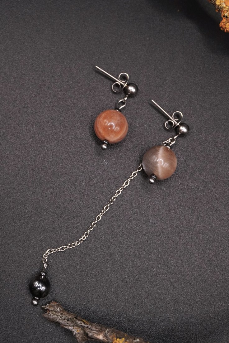 Asymetryczne kolczyki z kamieniem słonecznym i hematytem.