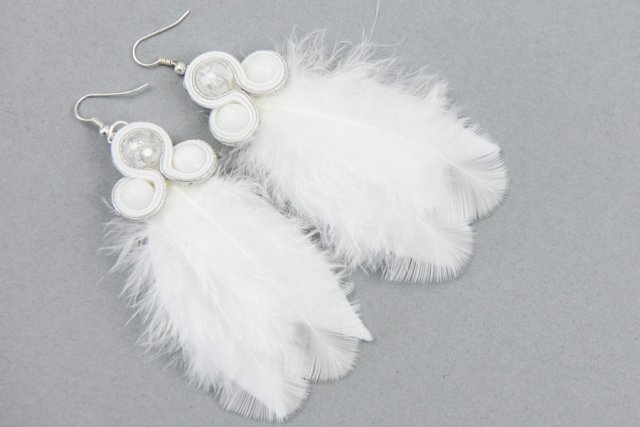 Kolczyki wykonane techniką soutache, przyozdobione naturalnymi, niezwykle efektownymi piórkami, podszyte miękkim filcem