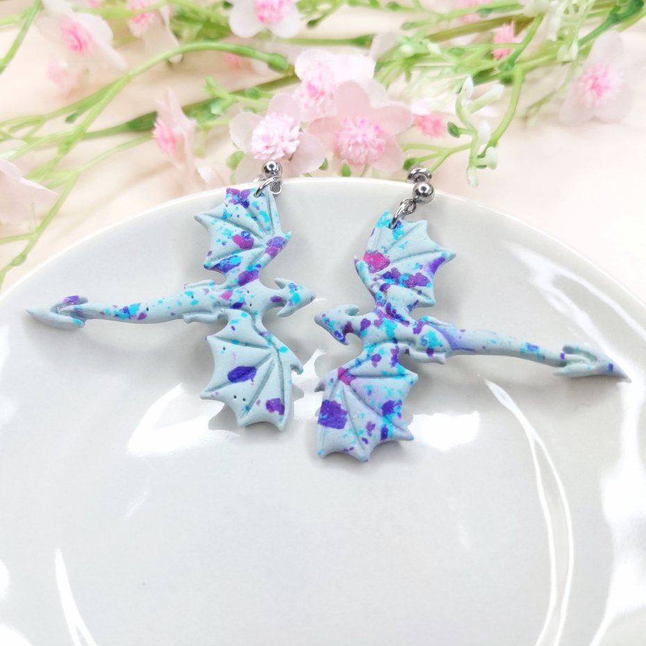 Kolczyki w kształcie smoków w odcieniach szarości, błękitu, różu, fioletu.
