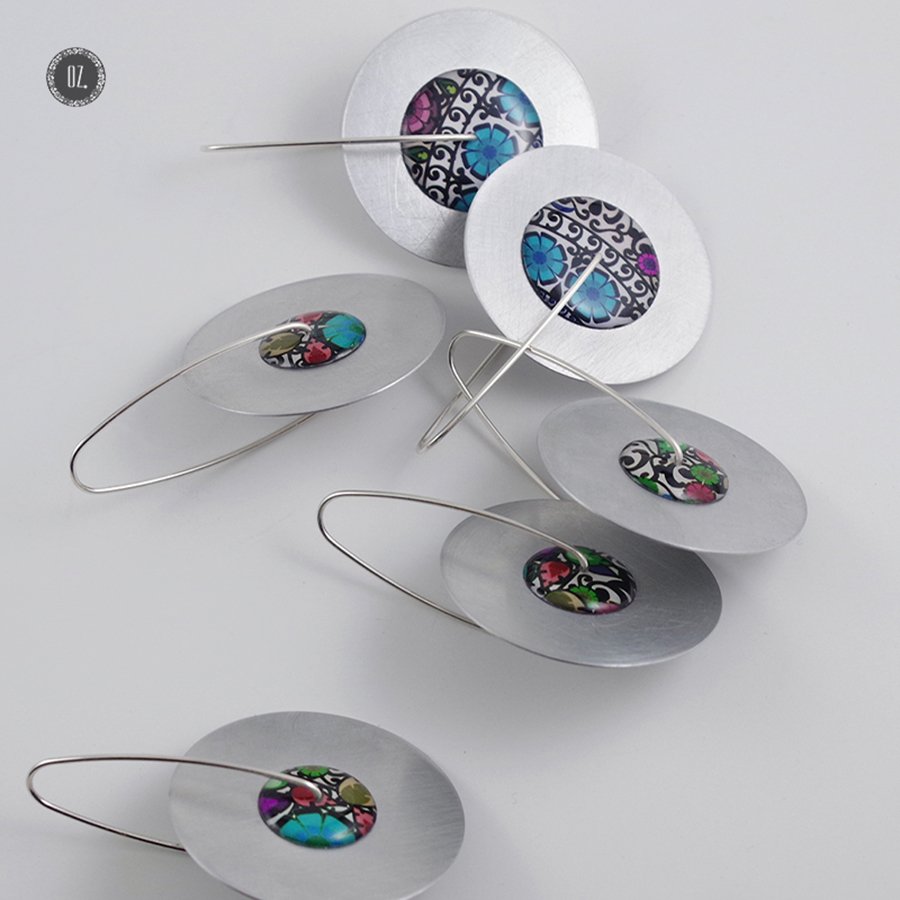 autorska kolorowa grafika zatopiona w żywicy, zapięcia ze srebra 925.