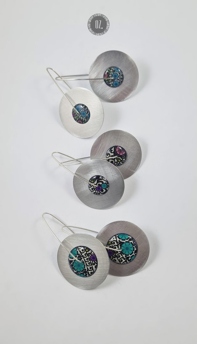 autorska kolorowa grafika zatopiona w żywicy, zapięcia ze srebra 925.