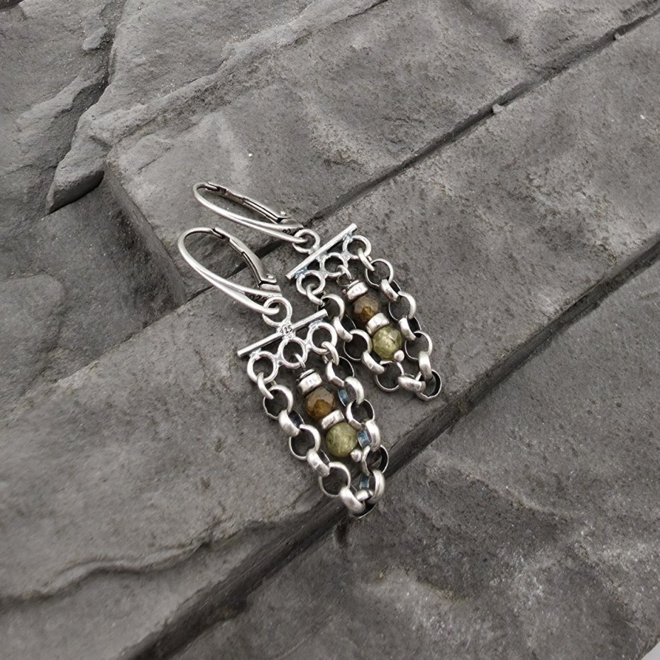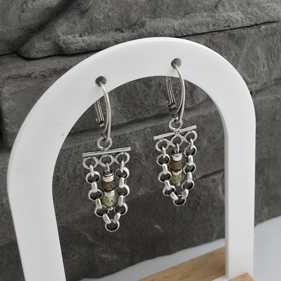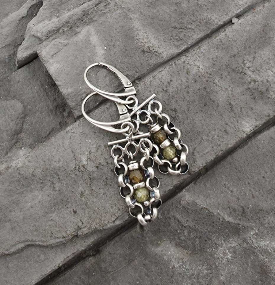 Oryginalne i kobiece kolczyki wykonane w całości z oksydowanego srebra próby 925 oraz szlifowanych kulek zielonego granatu wielkości 3,5-4 mm. Zapięcia zatrzaskowe typu angielskiego. Całkowita długość kolczyków to ok. 4,5 cm. Moge je też wykonać z innymi kamieniami. Ozdobnie zapakowane.