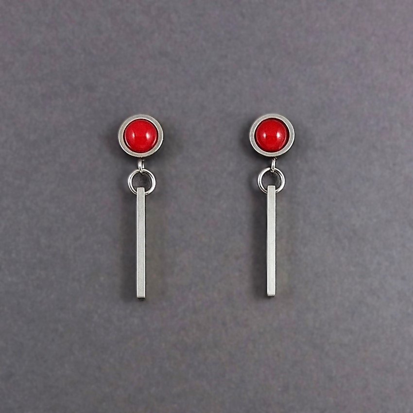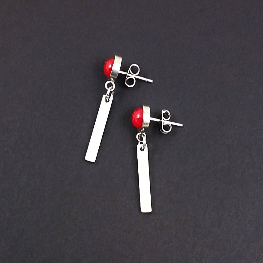 Bezpretensjonalne kolczyki z nieuczulającej stali szlachetnej, w pięknym kolorze rodowanego srebra. Na wygodnych sztyftach kaboszonach z czerwonych jadeitów, zawieszone są patyczki o wymiarach: 20 x 3 x 2mm. Kaboszony mają średnicę 8mm (razem z oprawą).