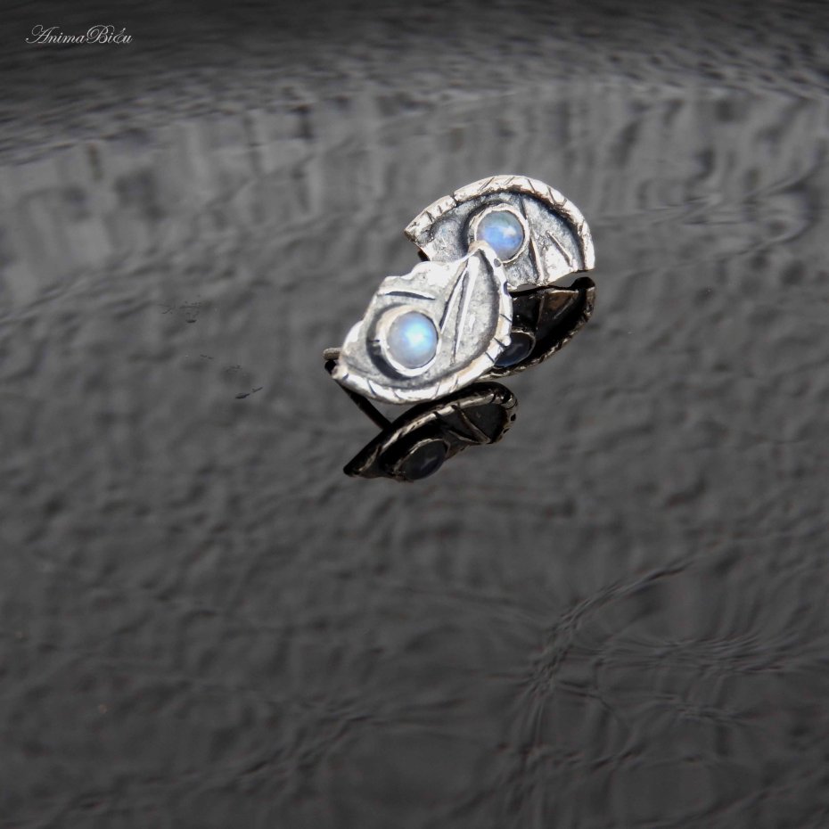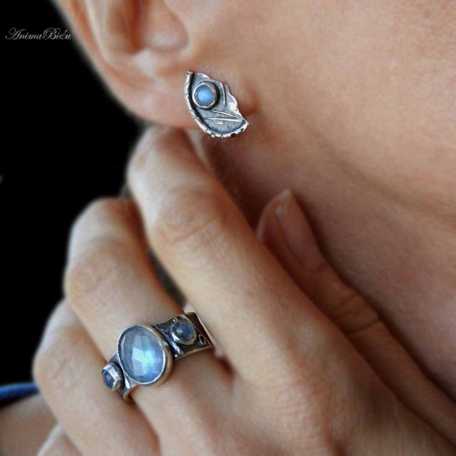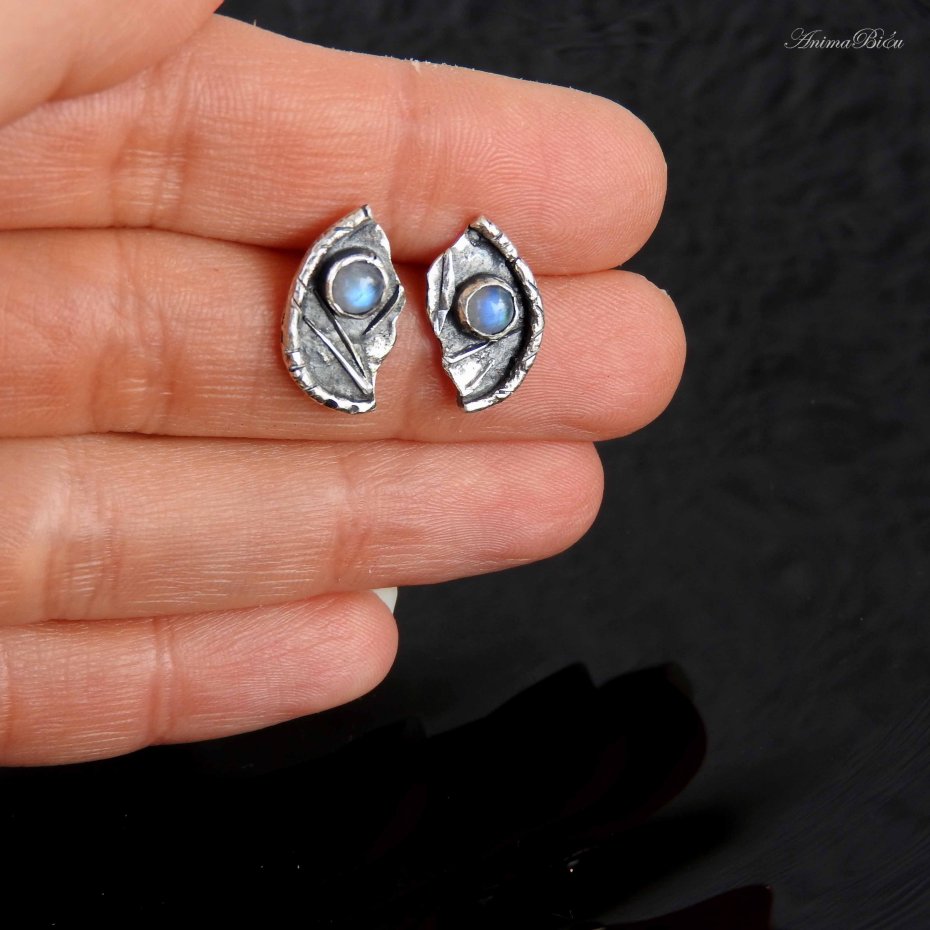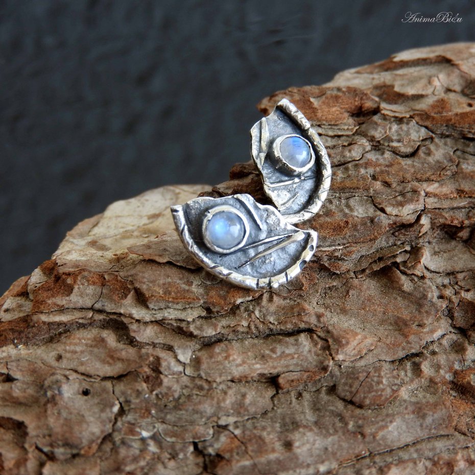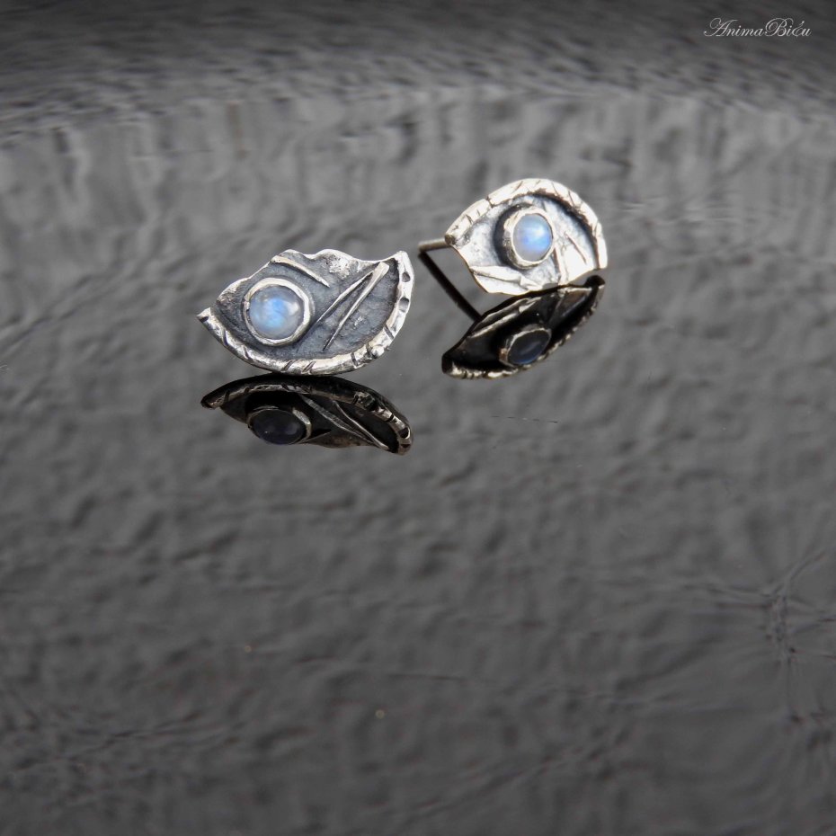 Kolczyki srebrne z kamieniami księżycowymi. Wykonane od podstaw ręcznie wkrętki powstały ze srebra próby 925, które mocno fakturowałam, oksydowałam i przetarłam. Zabiegi te nadały im surowego charakteru, który nieco łagodzi błękit księżycowych minerałów. Kolczyki nieznacznie (celowo) różnią się od siebie. Wymiary kolczyka 16 na 9 mm. Waga jednego 0,9 g. Technika wykonania: lutowanie, młotkowanie.