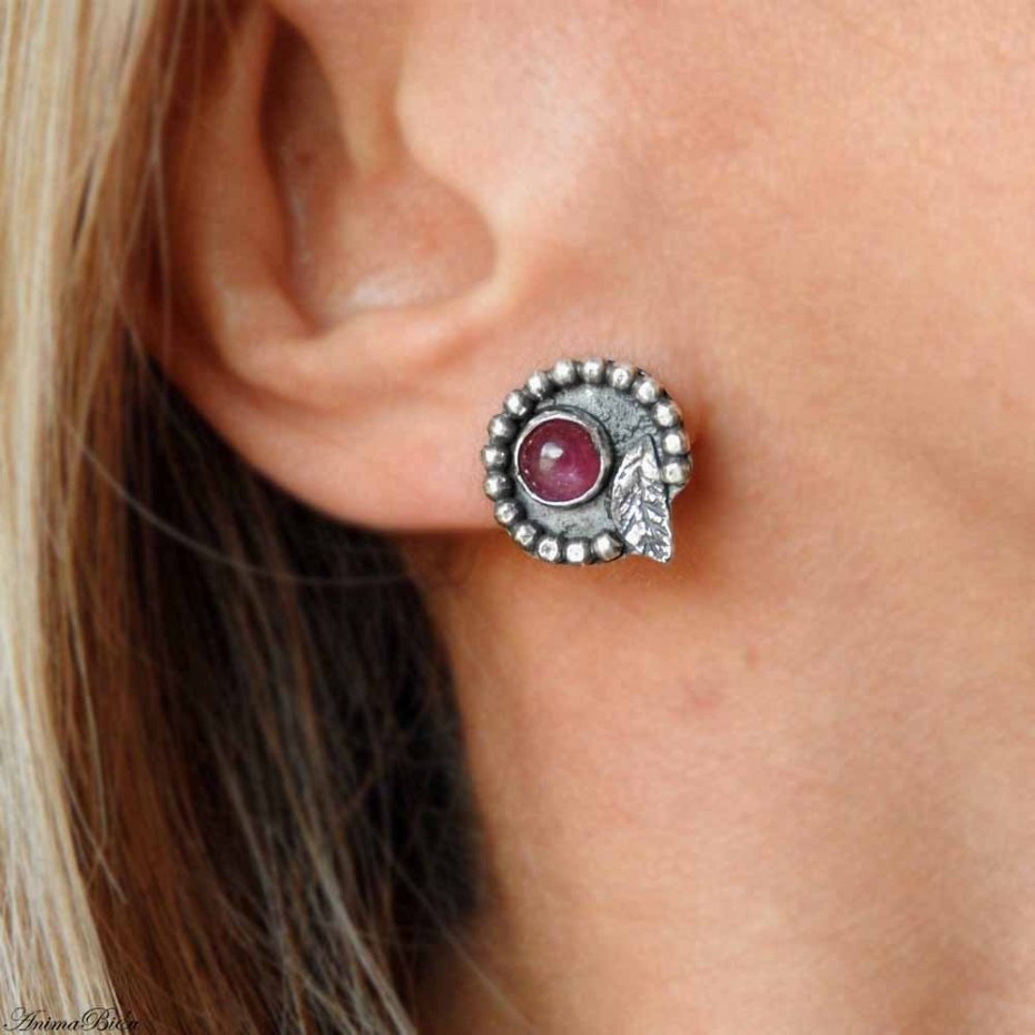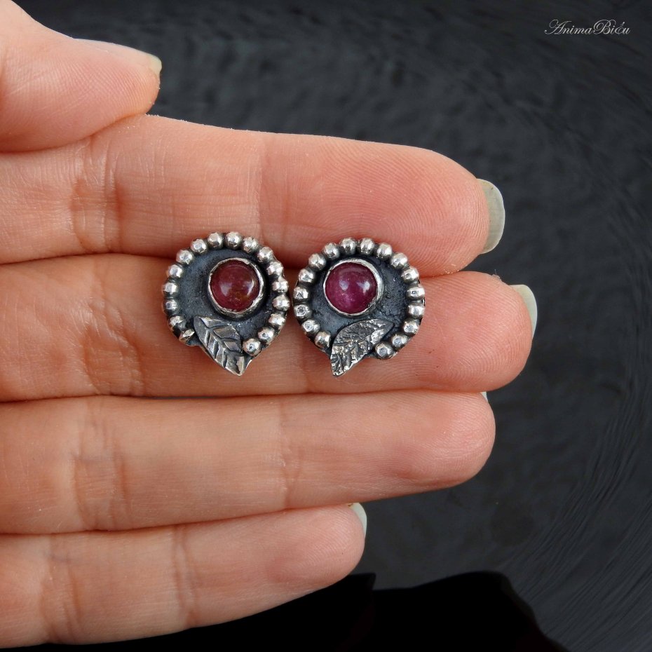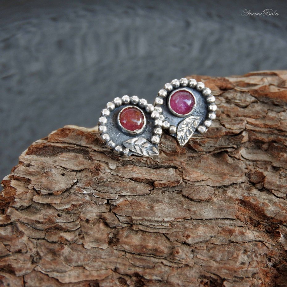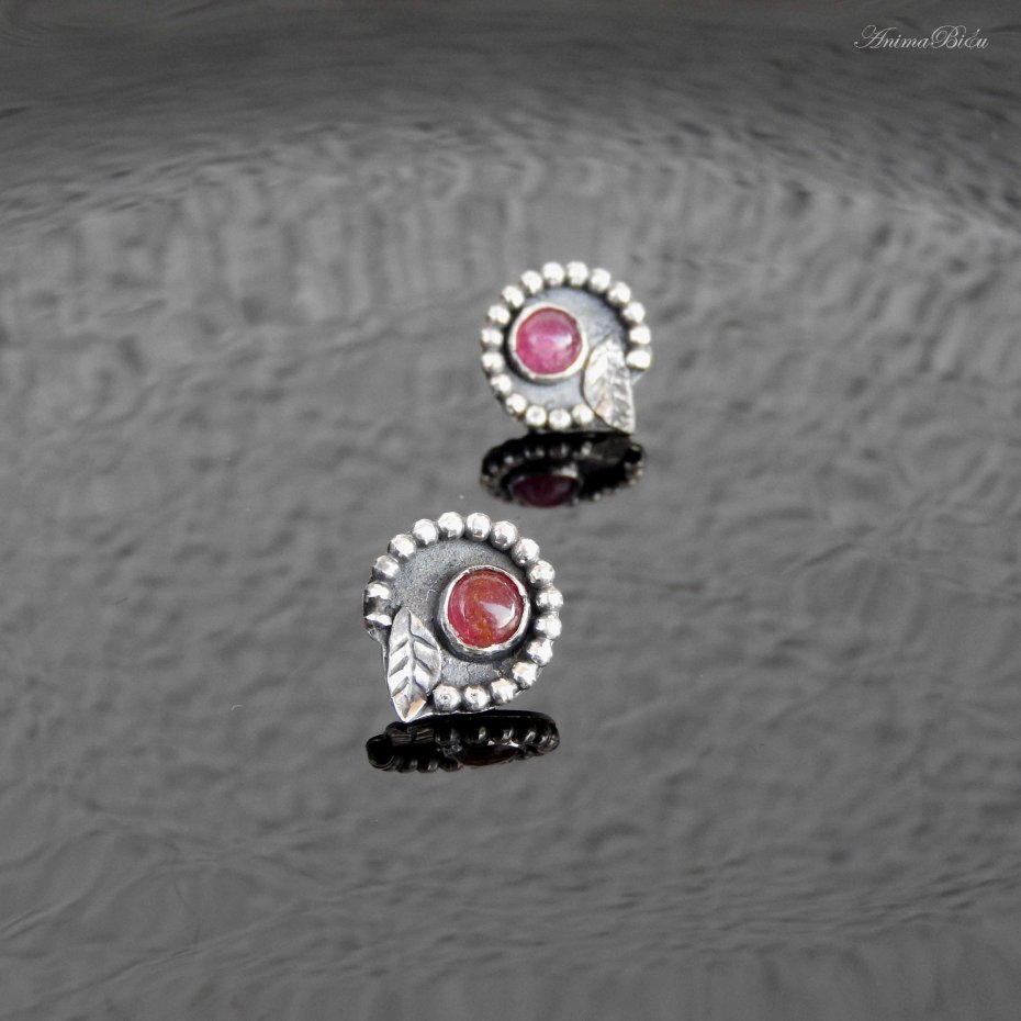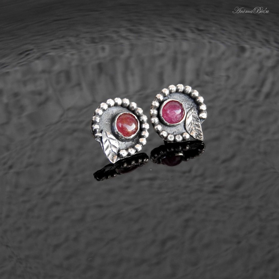 Kolczyki srebrne typu wkrętki z różowym turmalinem. Kolczyki wykonałam od podstaw ręcznie ze srebra próby 925 i 999, które dla podkreślenia zdobień przyciemniłam i wypolerowałam. Sercem kolczyków są okrągłe, naturalne turmaliny o różowej barwie, które pięknie korespondują z przyciemnianym srebrem. Kamienie nieznacznie różnią się od siebie odcieniem różu. Średnica kolczyków wynosi 15 milimetrów. Waga jednego to 2 gramy. Technika wykonania: lutowanie, młotkowanie.