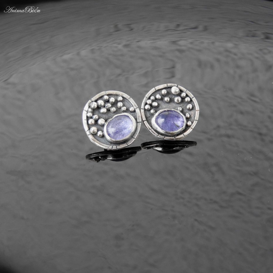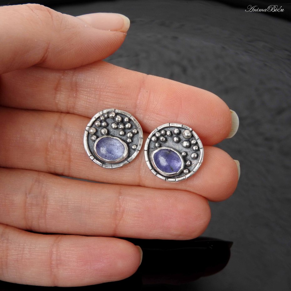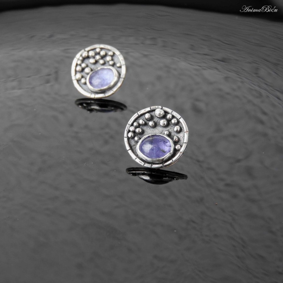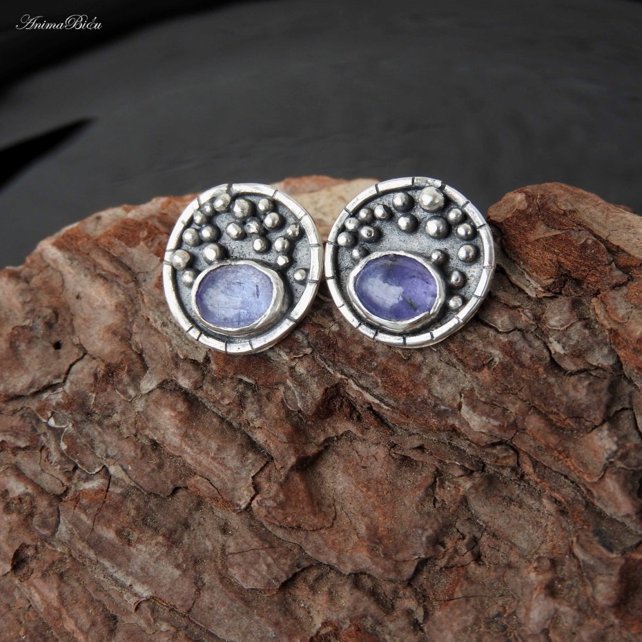 Kolczyki srebrne wkrętki z tanzanitem. Kolczyki wykonałam od podstaw ręcznie, kółeczka o średnicy 16 milimetrów wypełniłam srebrnymi kuleczkami, umieściłam owalny tanzanit o pięknej, jeansowej barwie, całość przyciemniłam i wypolerowałam, co uwydatniło zdobienia. Technika wykonania to lutowanie i młotkowanie, srebro próby 925 i 999. Waga kolczyka: 2,2 gramy. Wymiary tanzanitu to ok.6 na 8 mm. Tanzanit jest kamieniem szlachetnym. To minerał wydobywany w południowej części Tanzanii. Jest kamieniem rzadkim, nie mniej cennym niż diament, osławiony dzięki Elizabeth Taylor i firmie Tiffany, dziś określanym jako klasyka elegancji.