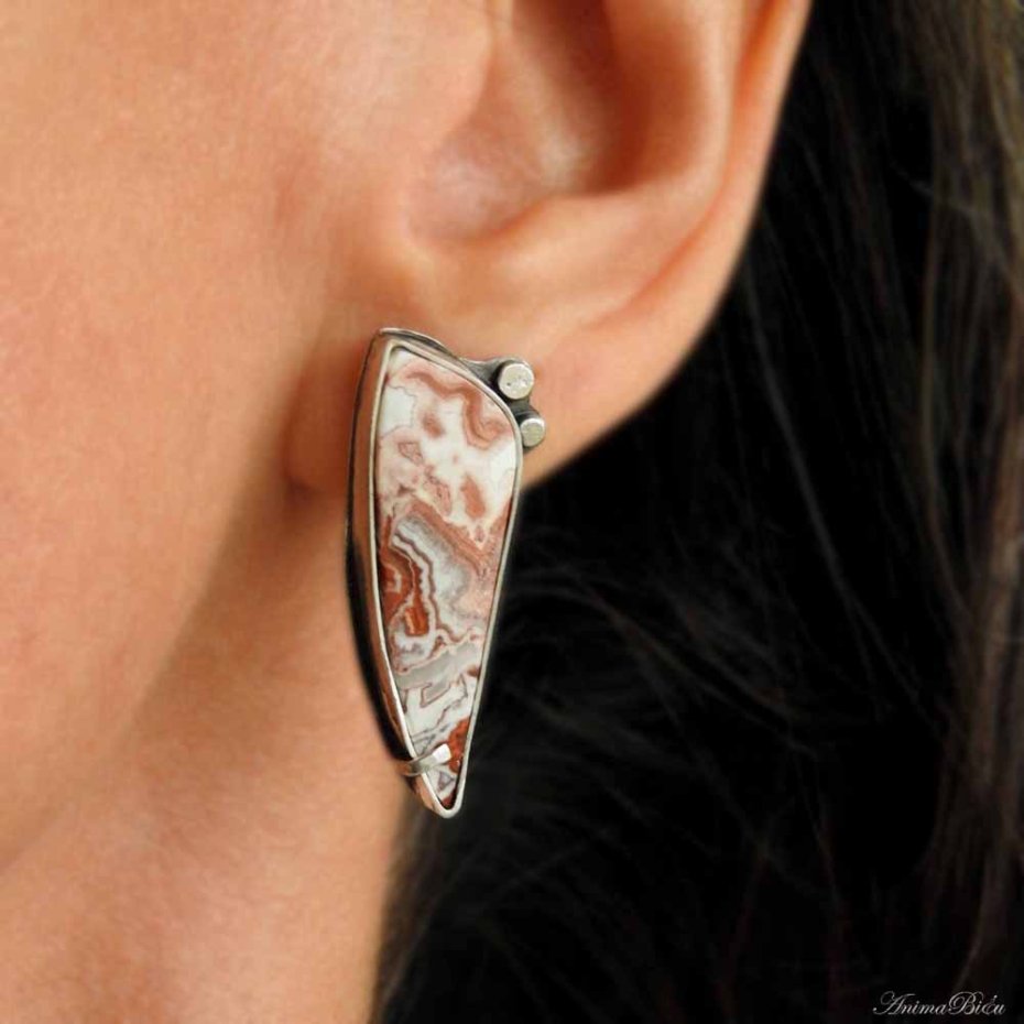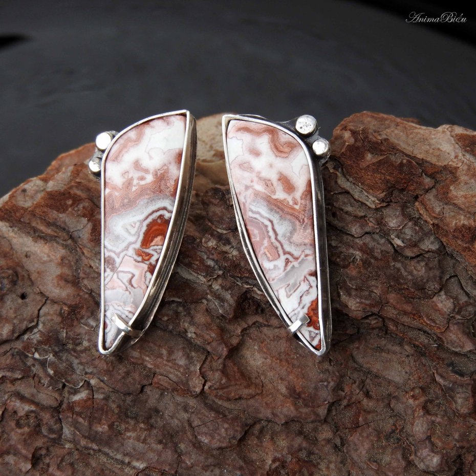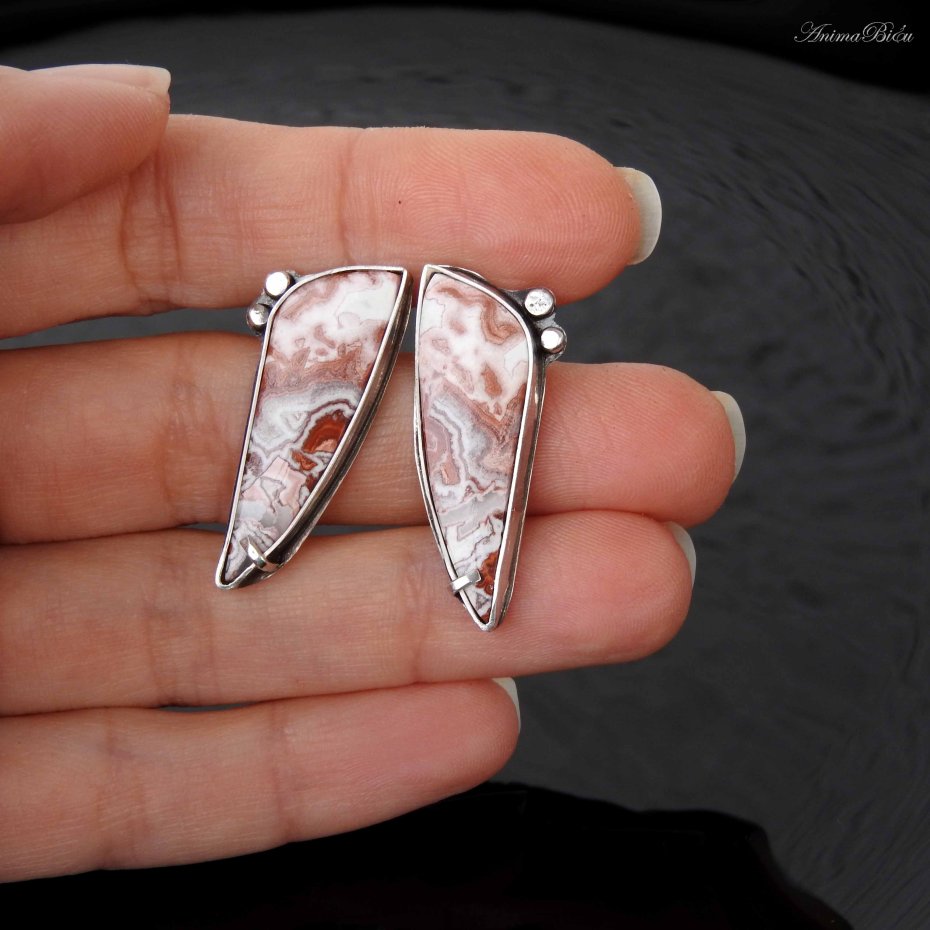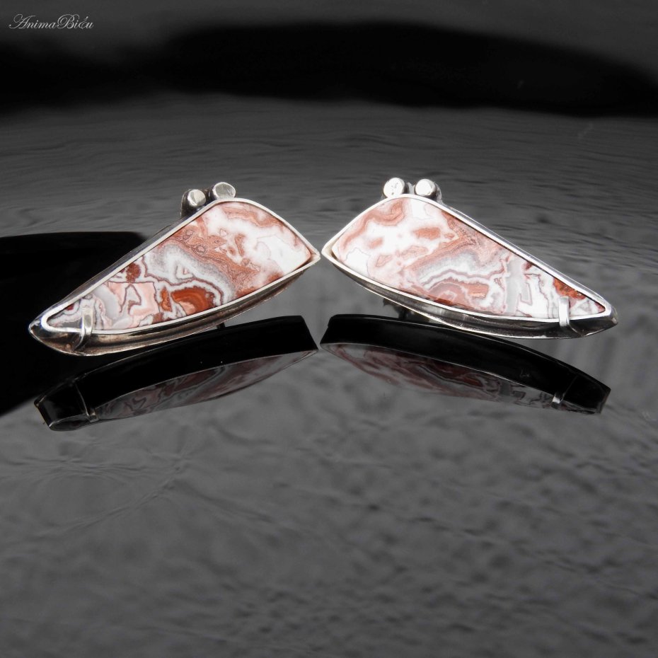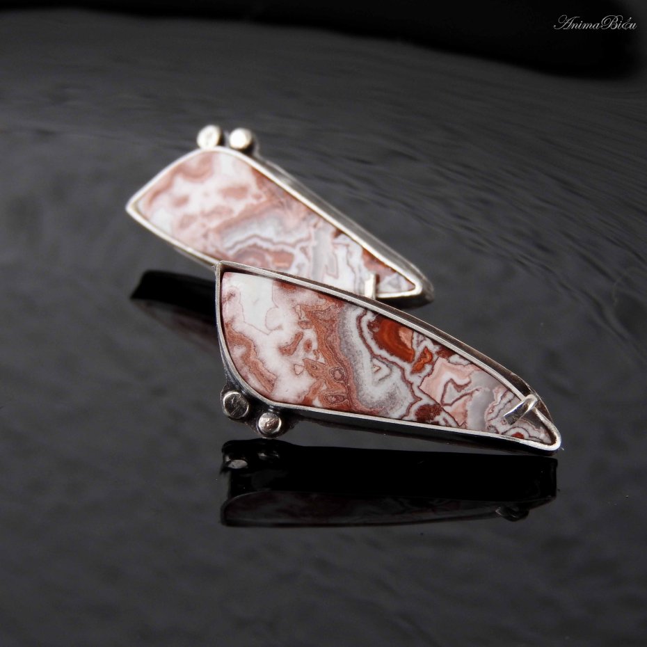 Kolczyki srebrne typu wkrętki z agatem crazy lace. Fantazyjny agat w kolorze czerwono różowo białym z fikuśnymi wzorkami oprawiłam ręcznie w srebro próby 925. Minerały mają tak ciekawy malunek, że postawiłam nie przyćmić ich mocną oprawą. W związku z tym kamienie osadziłam w kasetkach, dodałam przytrzymującą łąpkę i ozdobiłam bok dwoma płaszczonymi kuleczkami. Srebro przyciemniłam i wypolerowałam. Długość kolczyka wynosi 33mm i ma szerokość 13mm. Waga jednego to 4,4 gramy. Technika wykonania: lutowanie, młotkowanie.