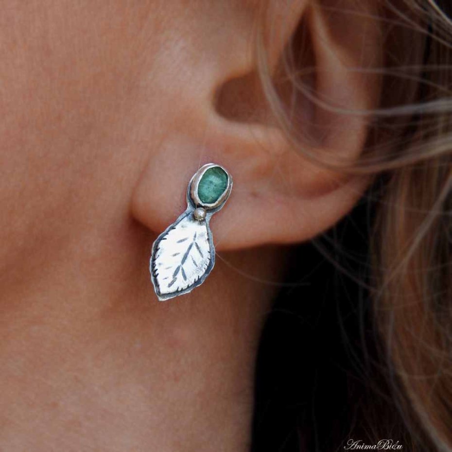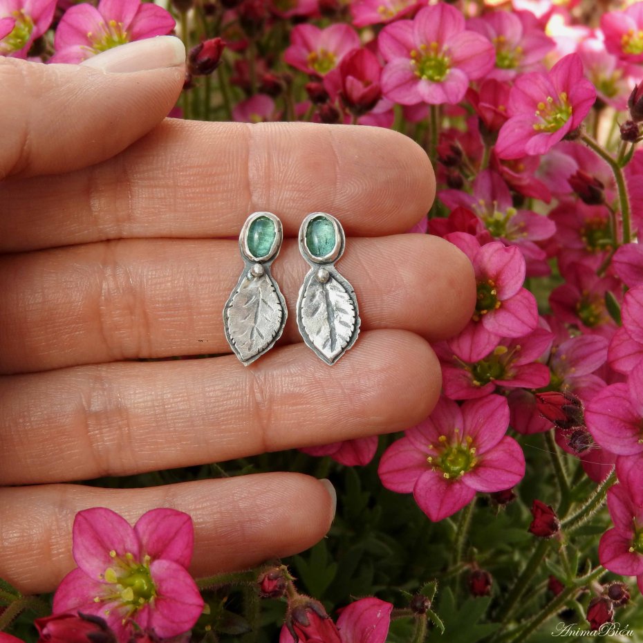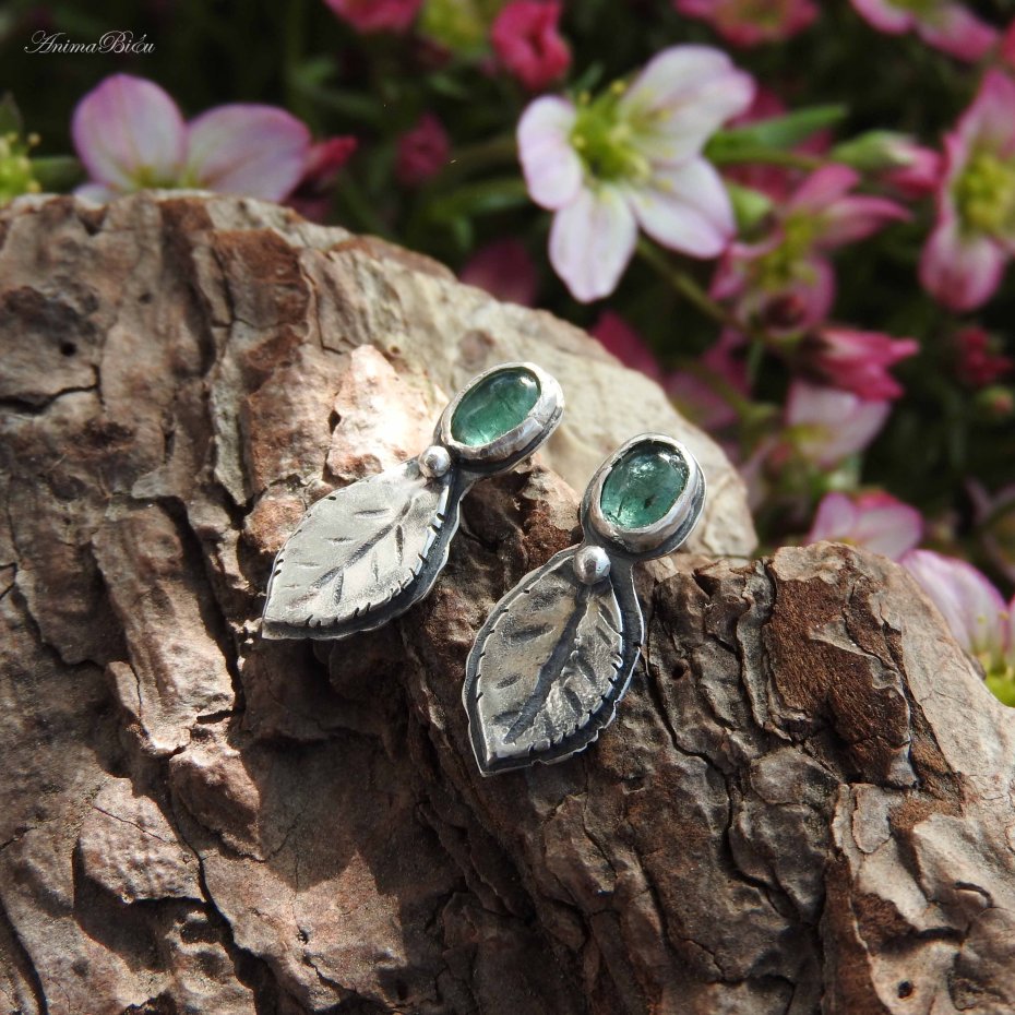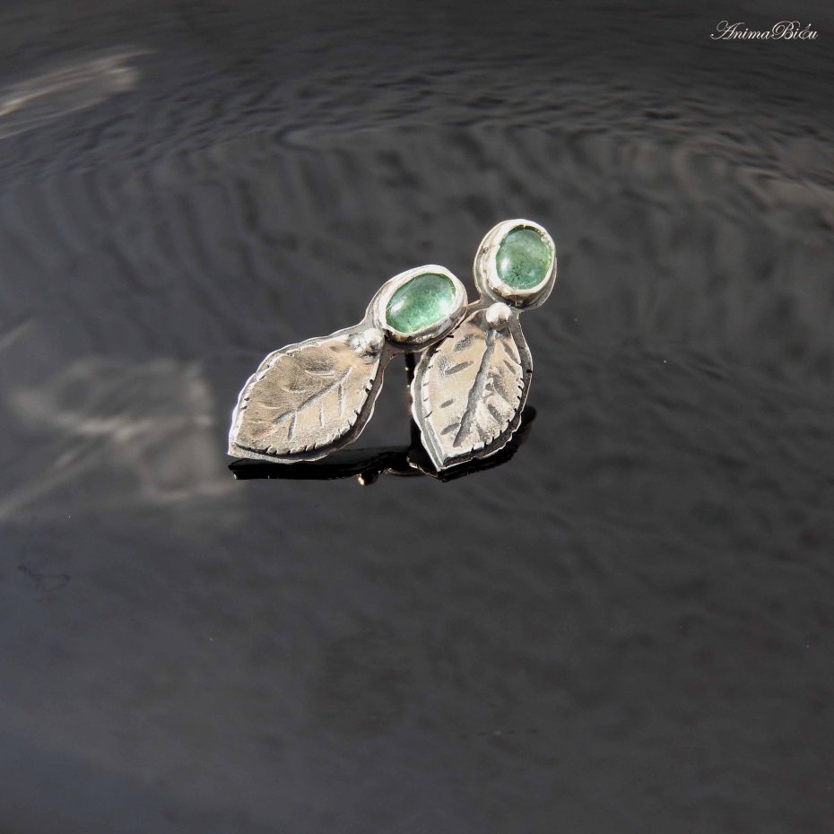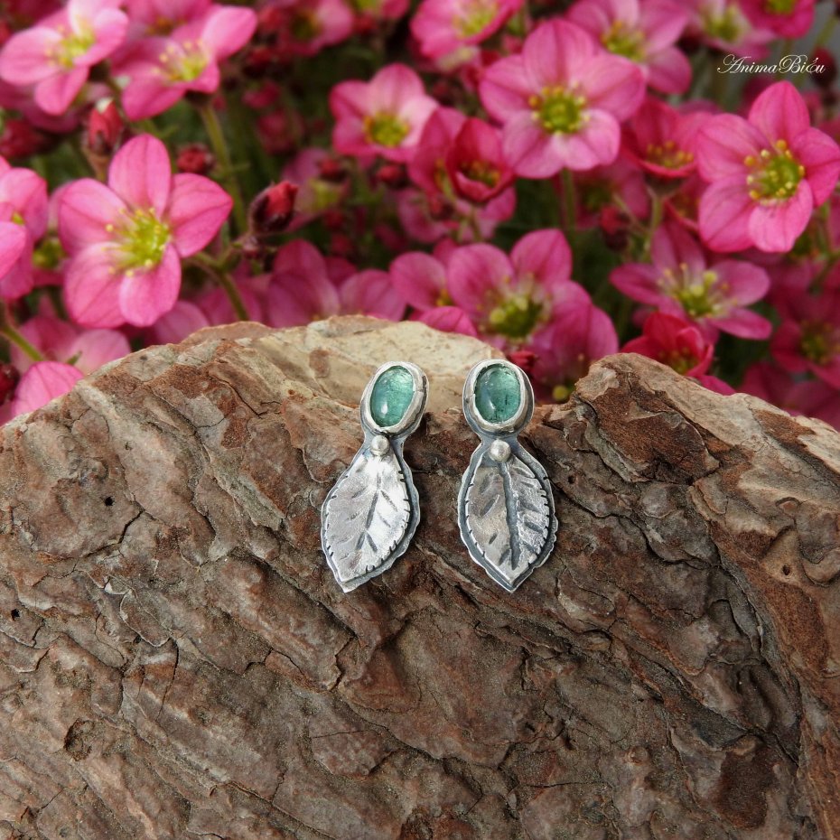 Kolczyki srebrne z indygolitem. Rzadko spotykane, cudowne indygolity, czyli turmaliny w kolorze niebieskim oprawiłam ręcznie w srebro próby 925, tworząc subtelne wkrętki, które dodadzą uroku każdej stylizacji. Poniżej owalu kamieni umieściłam srebrne, rzeźbione listki i kuleczkę. Długość kolczyka wynosi 21 mm, szerokość w najszerszym miejscu to 9 mm. Waga jednego 1,3 grama. Srebro przyciemniłam i wypolerowałam. Technika wykonania: lutowanie, młotkowanie.