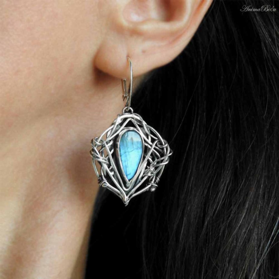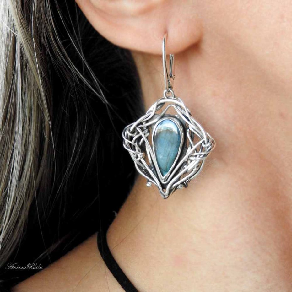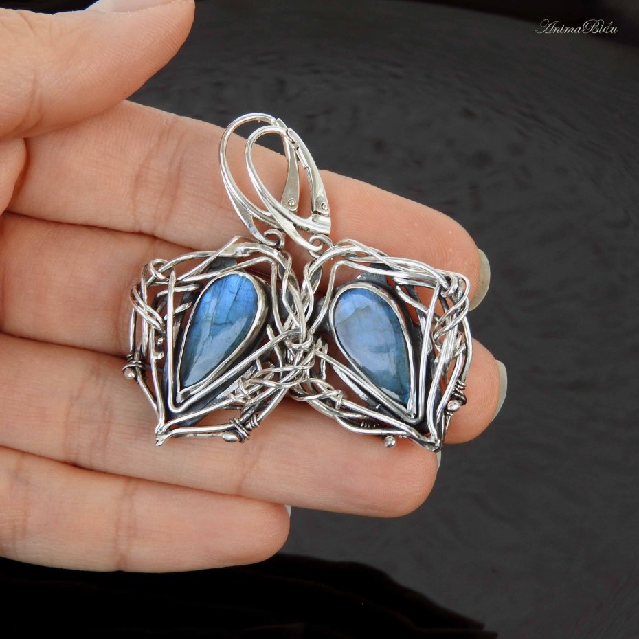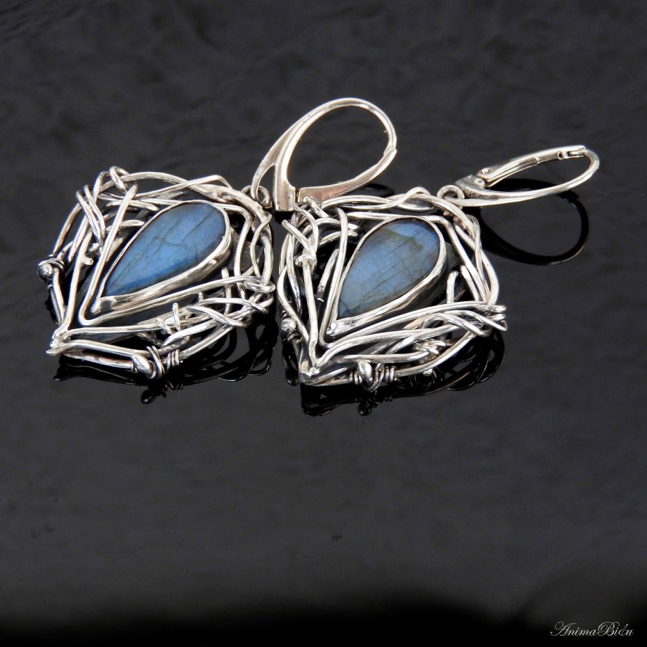 Kolczyki srebrne z labradorytem. Wykonane o podstaw ręcznie kolczyki powstały ze srebra próby 925 i 999. Liczne sploty i zawijasy okalają piękne łezki labradorytów o intensywnej, niebieskiej iryzacji. Srebro przyciemniłam i wypolerowałam, co podkreśliło trójwymiarowość zdobień. Kolczyki zawiesiłam na angielskich biglach. Długość całości wraz z biglem wynosi 48 mm, szerokość 27 mm. Waga jednego to 6,2 gramy. Technika wykonania: lutowanie, młotkowanie. Cechowane w Urzędzie Probierczym.