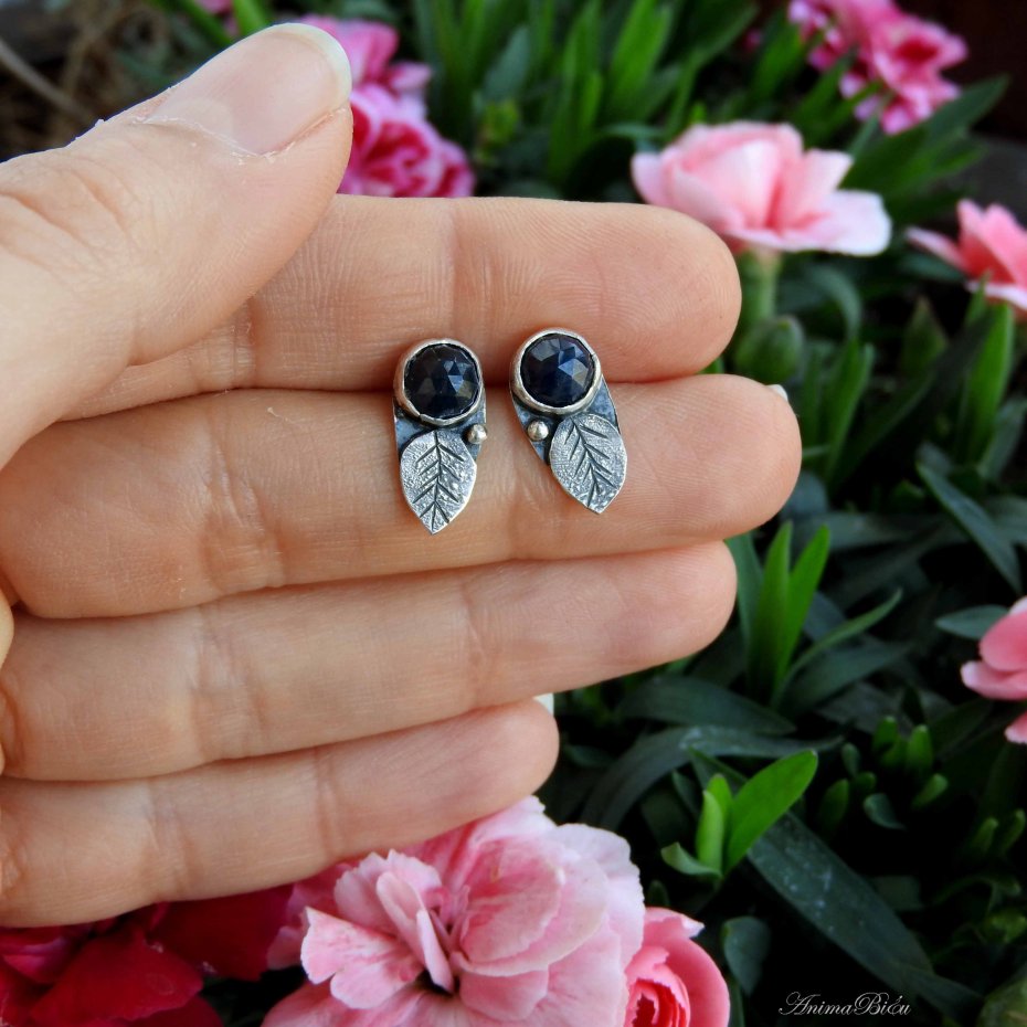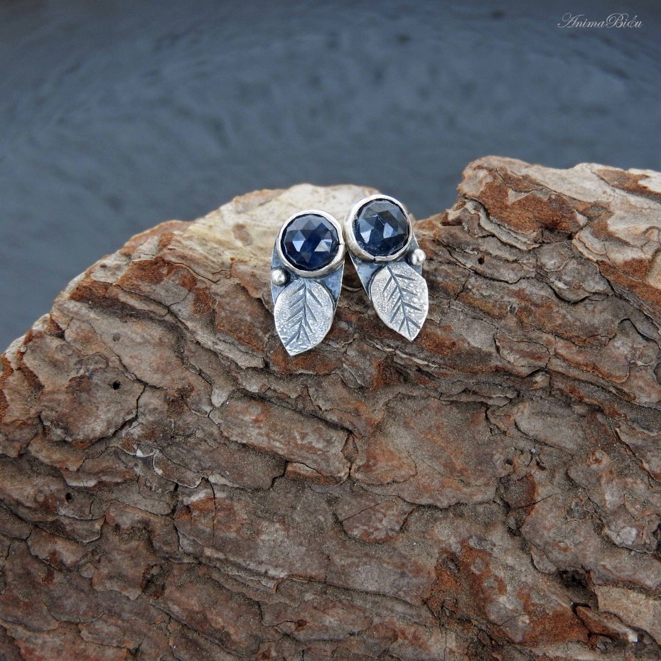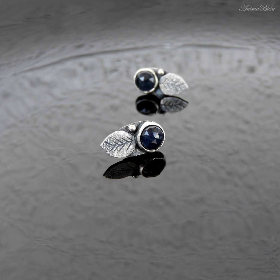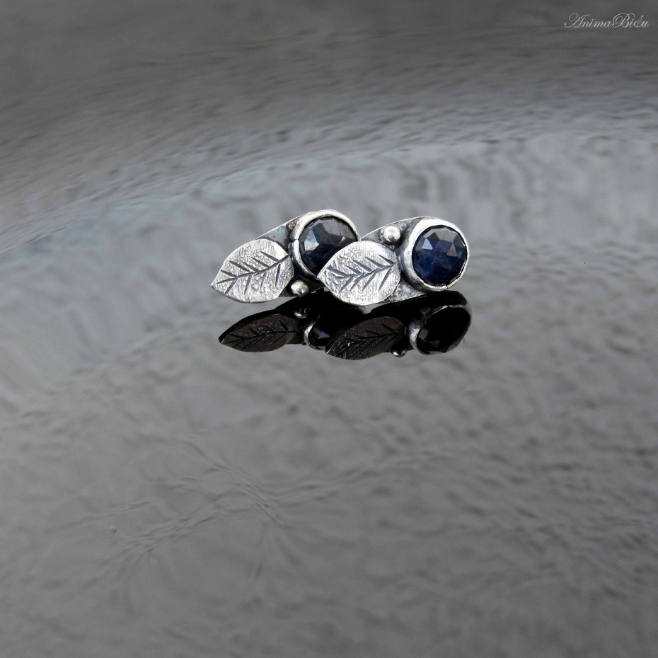 Kolczyki srebrne z szafirami. Ręcznie wykonane wkrętki powstały ze srebra próby 925, które mocno przyciemniłam i wypolerowałam. Urocze, fasetowane szafiry umieściłam powyżej rzeźbionego listka. Długość kolczyka wynosi 16 mm, szerokość 7 mm. Waga jednego: 1,2 grama. Technika wykonania: lutowanie, młotkowanie.