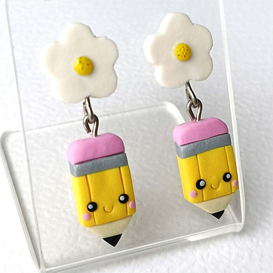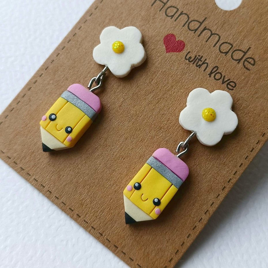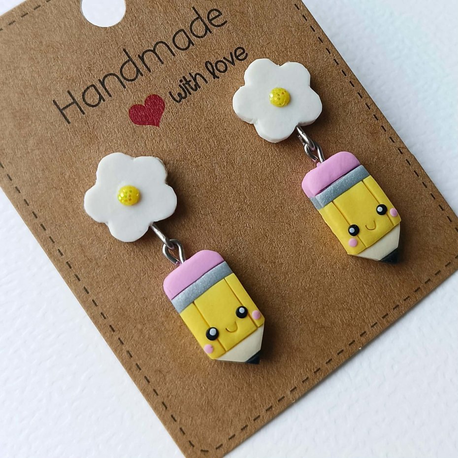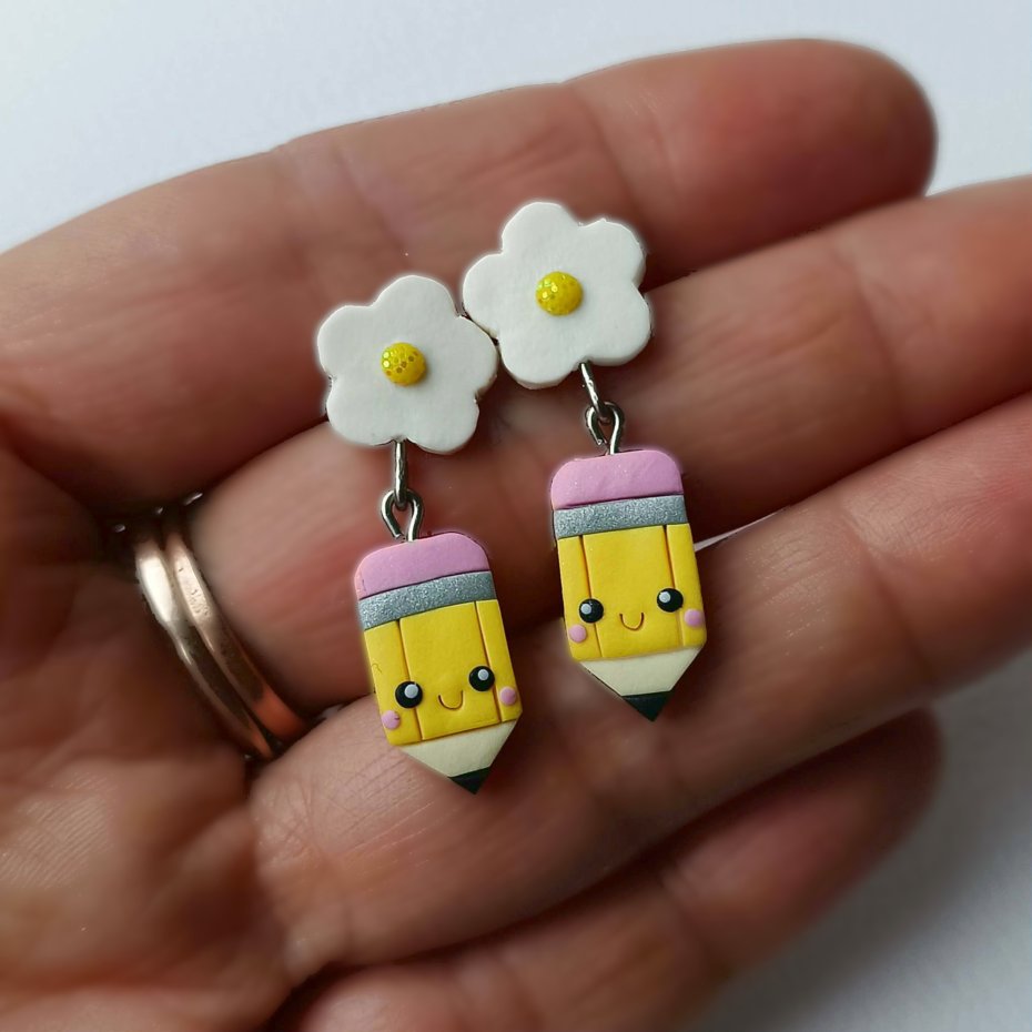 Wykonane ręcznie z gliny polimerowej, zachwycają świeżymi kolorami i subtelnymi detalami. Stokrotka dodaje lekkości i dziewczęcego uroku, a ołówek wprowadza kreatywny, szkolny klimat.