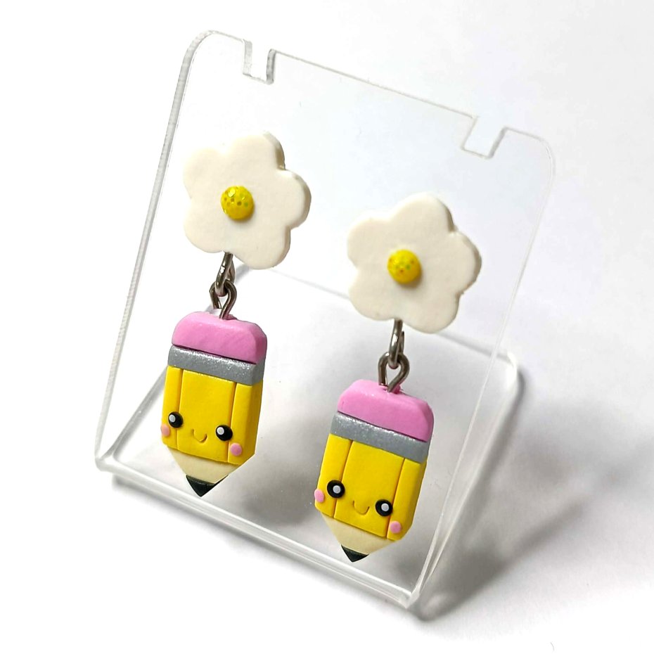 Urocze kolczyki z motywem stokrotki i ołówka to połączenie delikatności i zabawnego, szkolnego akcentu.