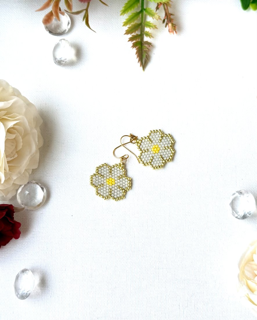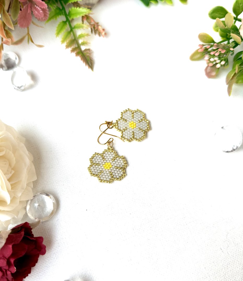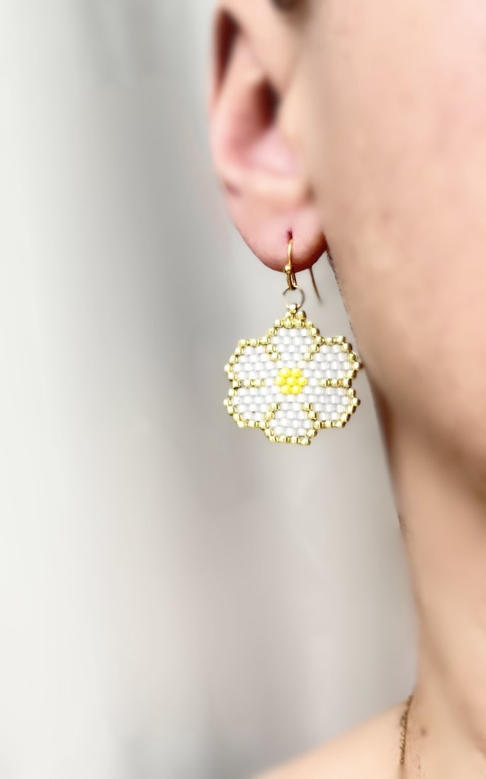Te urocze kolczyki to ręcznie wykonane dzieło sztuki z koralików w kolorze perły i złotych detali. Inspirowane naturą, przypominają pachnącą stokrotkę, która rozkwitnie na Twoich uszach. Wykonane z bigli ze stali chirurgicznej – idealne dla wrażliwych uszu, które potrzebują komfortu i elegancji.