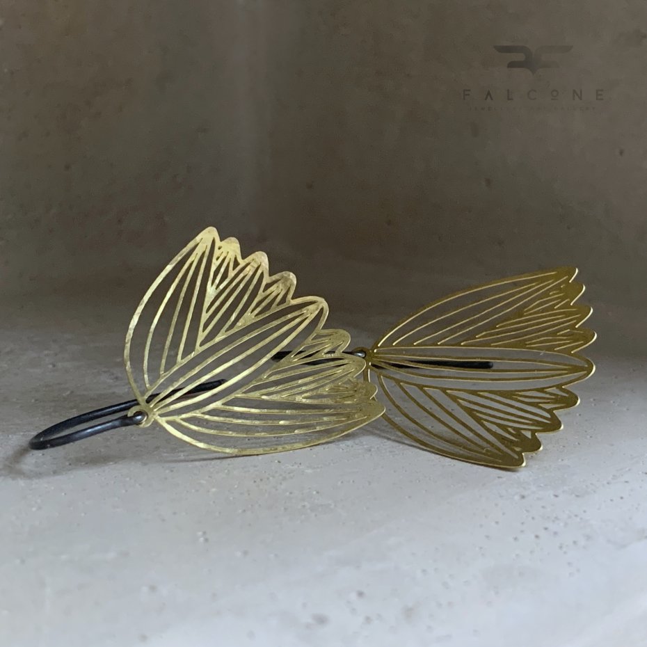 Kolczyki ze srebra i mosiądzu. Efektowne, ażurowe kwiaty, z mosiądzu w kolorze złota. Kwiaty w formie dzwonków, mają delikatnie repusowaną, wklęsłą powierzchnię polerowaną na połysk. Kolczyki są delikatne i lekkie. Bigle typu haki ze srebra 925. Szerokość kolczyków to ok. 3 cm. Długość kolczyków to ok. 3,5 cm.