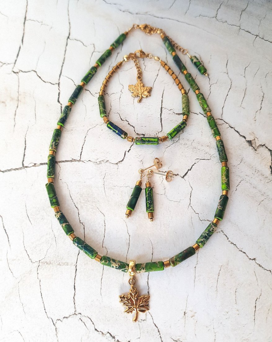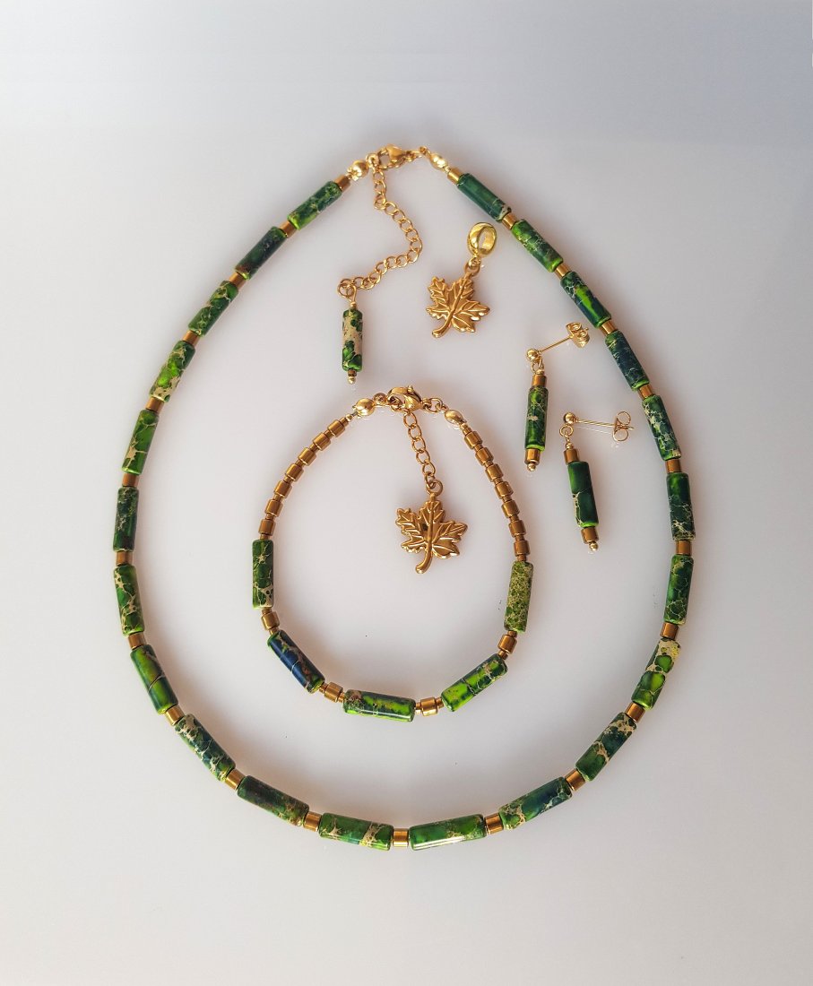 Wałeczki złotego hematytu i słupek zielonego jaspisu.