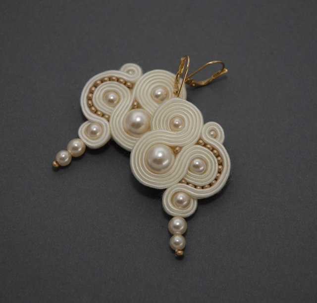 oferuję kolczyki zrobione haftem sutasz, ozdobione koralikami. Sznurek jest w kolorze kremowym