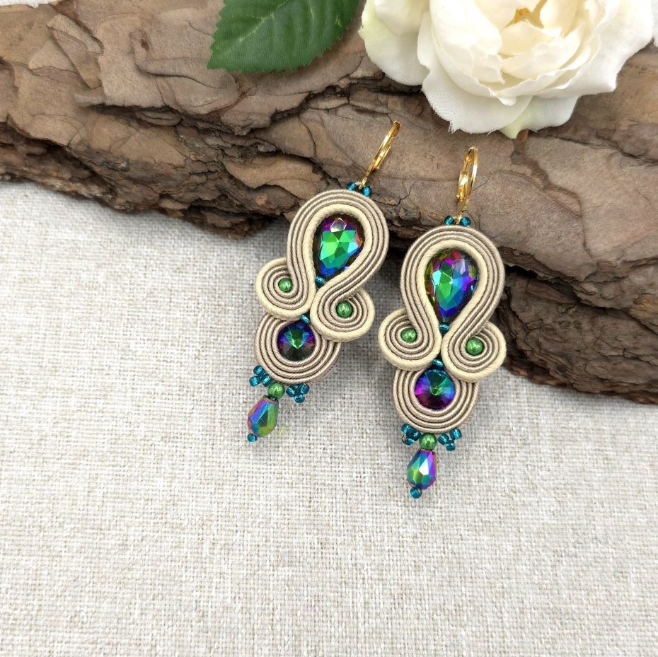 Kolory: beżowy, zielone koraliki, multikolorowe kryształki i łezki.