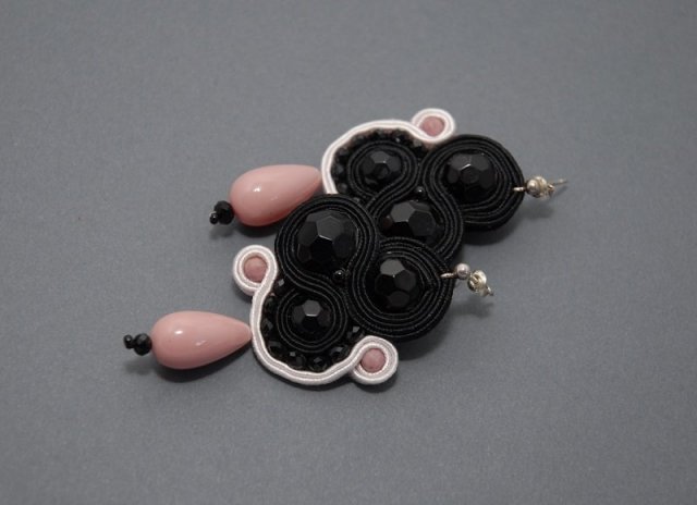 oferuję kolczyki zrobione haftem sutasz, ozdobione onyksami, rodonitami i koralikami szklanymi.