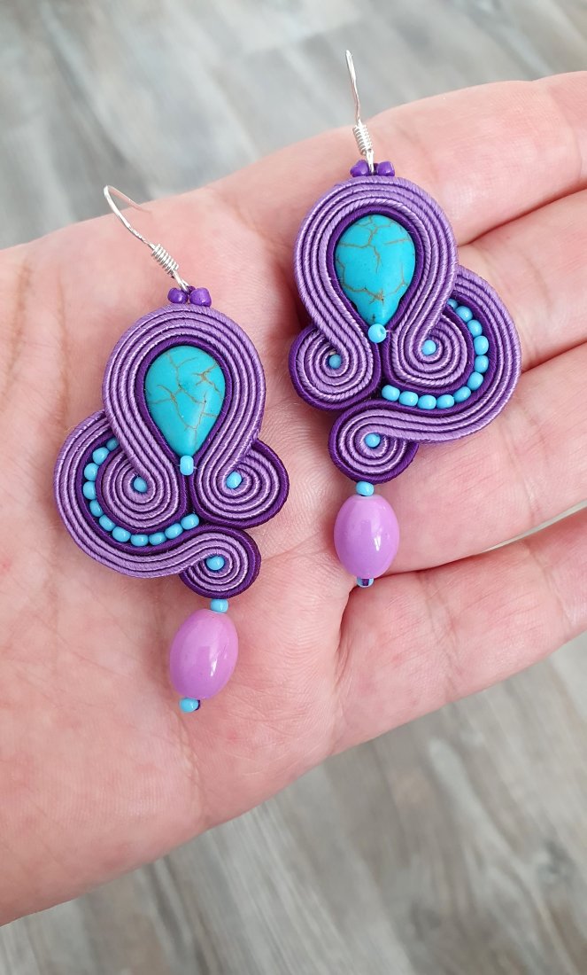 Lekkie kolczyki wykonane pracochłonną techniką haftu sutasz.