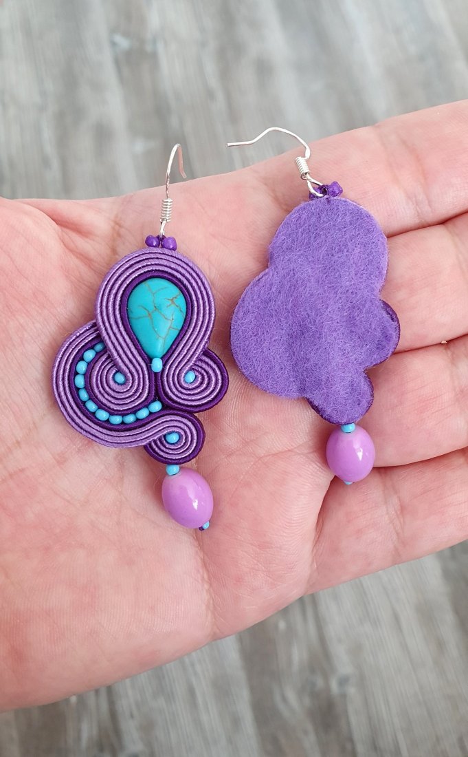 Z tyłu kolczyki zostały podklejone tkaniną welurową w kolorze fioletowym.