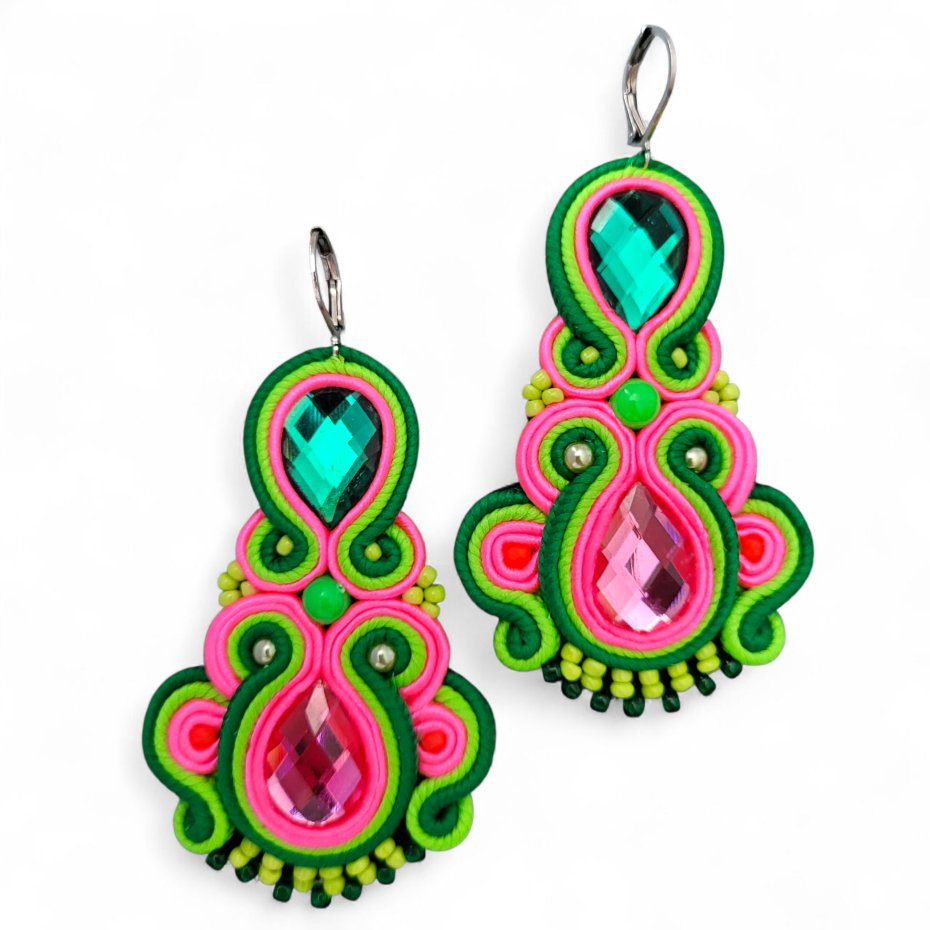 Lekkie kolczyki wykonane pracochłonną techniką haftu sutasz.