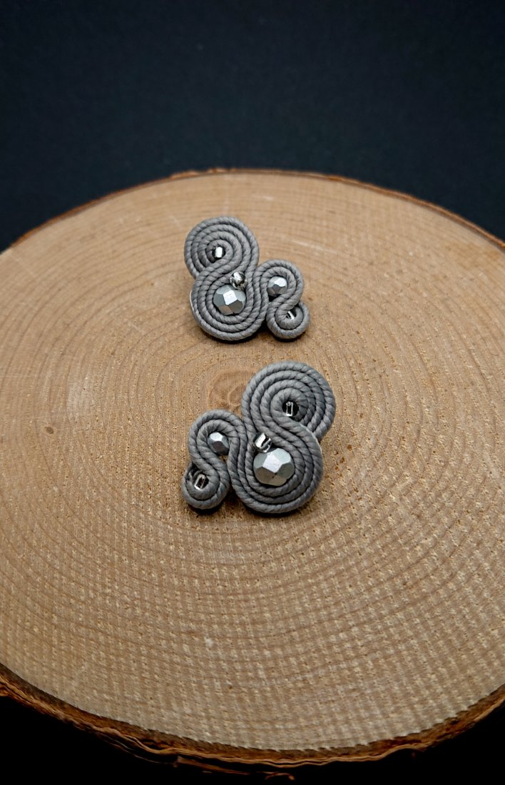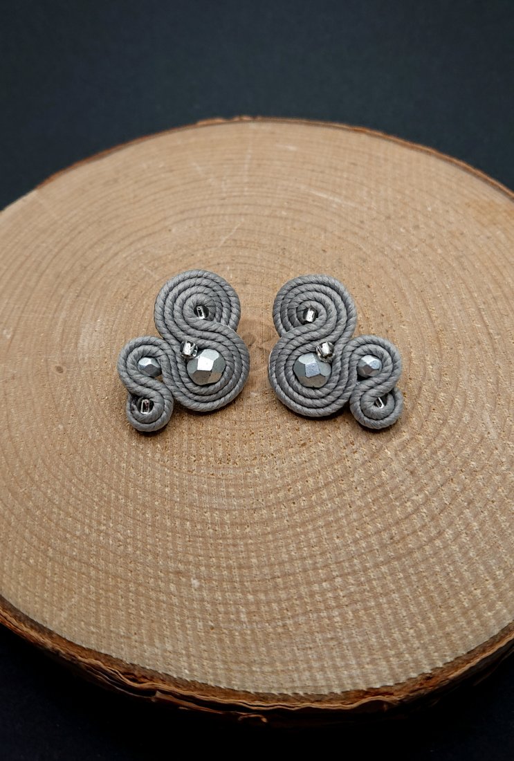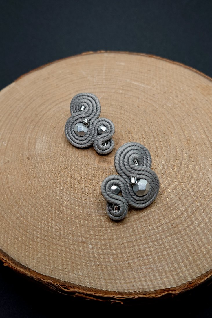 Niewielkie kolczyki sutasz wykonane z szklanych koralików oraz polskich sznurków sutasz. Kolory w kolczykach: szary. Kolczyki zamocowane na sztyftach ze stali chirurgicznej.