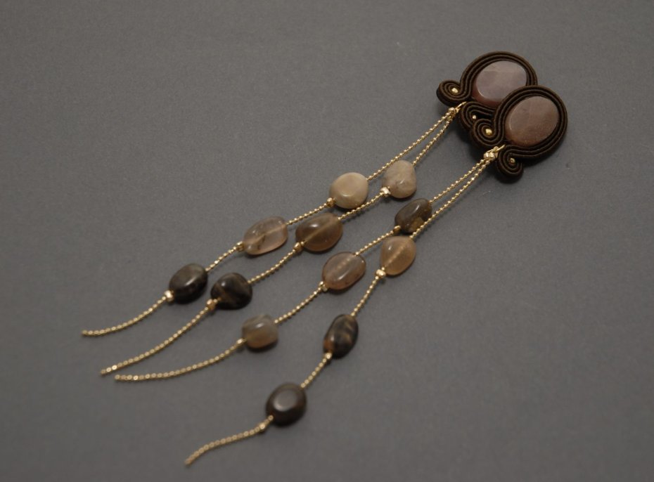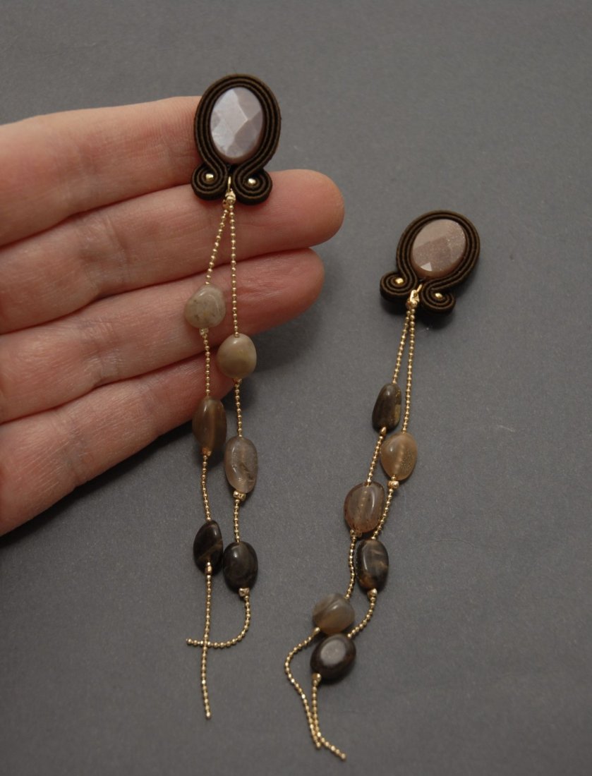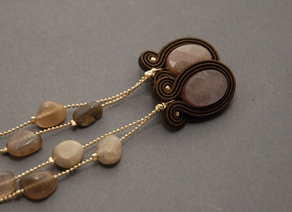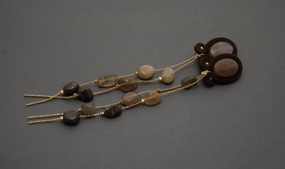 Kolczyki zrobione techniką sutasz, ozdobione dużymi, fasetowanymi i drobnymi kamieniami słonecznymi. Drobne kamyki zamontowane są na pozłacanym łańcuszku.