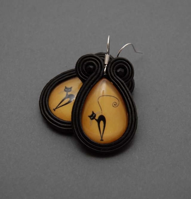 oferuję kolczyki zrobione haftem sutasz, ozdobione szklanym kaboszonem z kotami