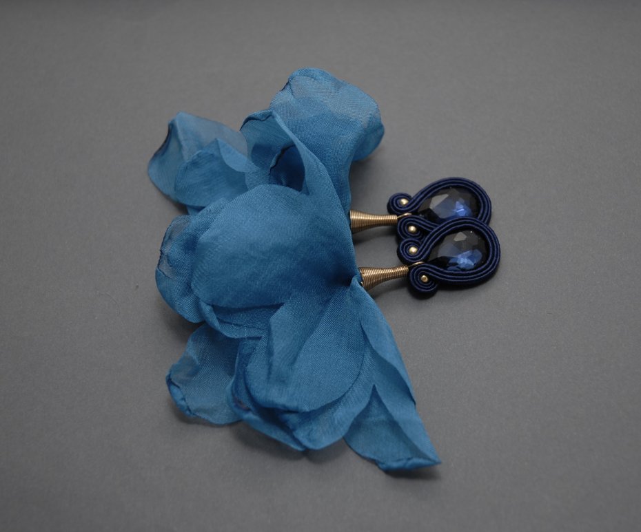 oferuję kolczyki zrobione techniką sutasz, ozdobione fasetowanymi kaboszonami i kwiatkami szyfonowymi