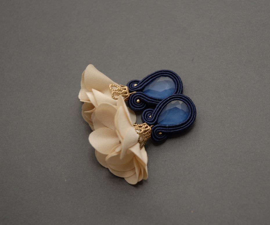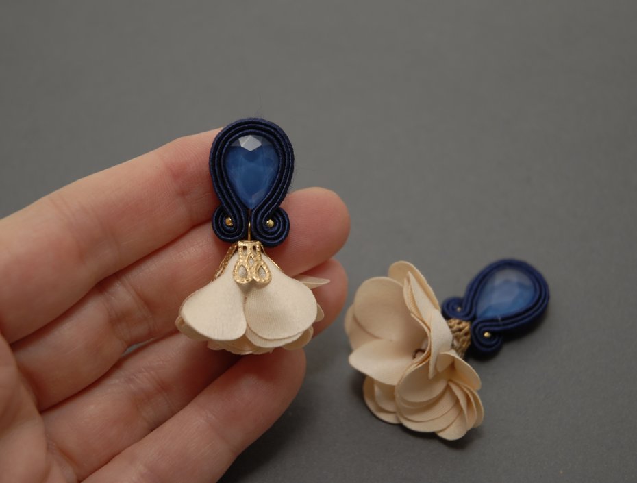 oferuję kolczyki zrobione techniką sutasz, ozdobione szklanym kaboszonem i kwiatkami z materiału