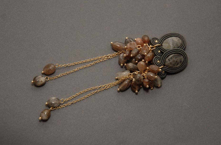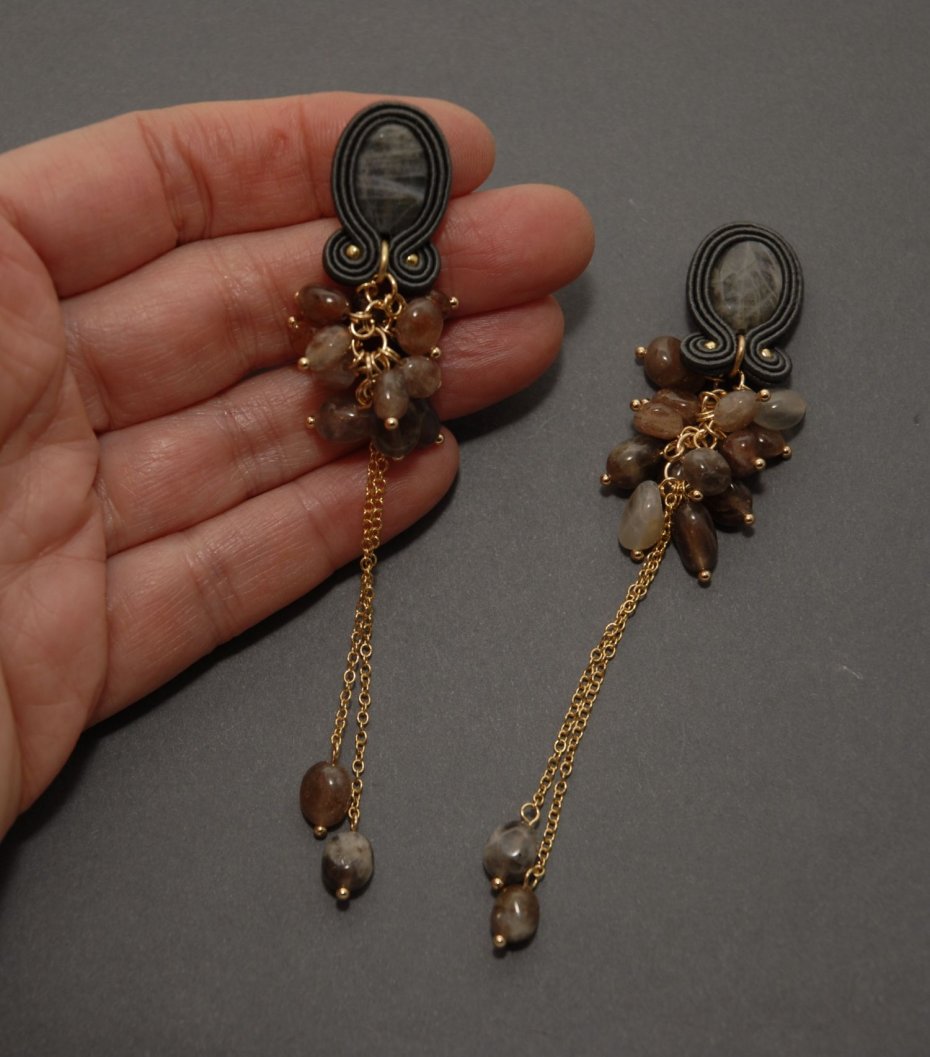 Kolczyki zrobione techniką sutasz, ozdobione fasetowanymi labradorytami i drobnymi agatami. Agaty zamontowane są na pozłacanym łańcuszku.