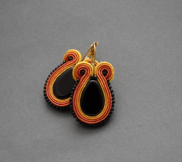 oferuję kolczyki zrobione techniką sutasz, ozdobione dużymi onyksami i drobnymi koralikami