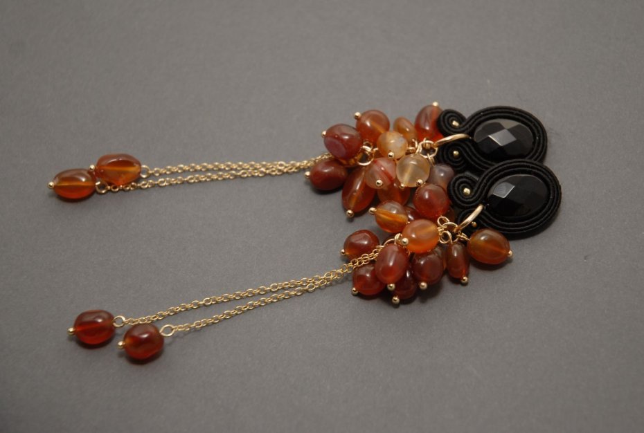 Kolczyki zrobione techniką sutasz, ozdobione fasetowanymi onyksami i drobnymi agatami. Agaty zamontowane są na pozłacanym łańcuszku.