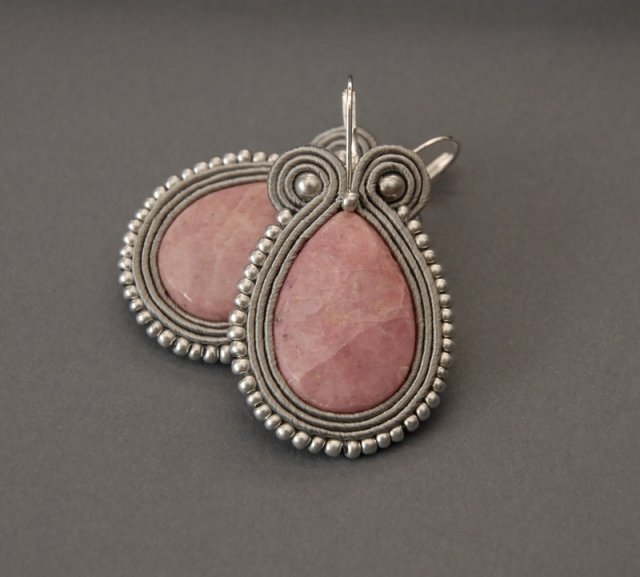 oferuję kolczyki zrobione techniką sutasz, ozdobione fasetowanymi rodonitami i koralikami