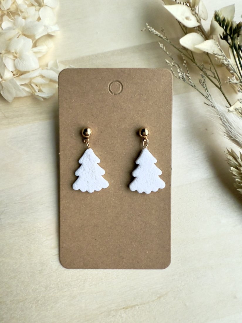 Delikatne, świąteczne kolczyki w kształcie białych choinek, wykonane z gliny polimerowej o subtelnej, strukturalnej powierzchni. Złote lub srebrne kulki przy sztyftach dodają im elegancji, a jednocześnie całość pozostaje lekka i uniwersalna – idealna do codziennych, zimowych stylizacji.