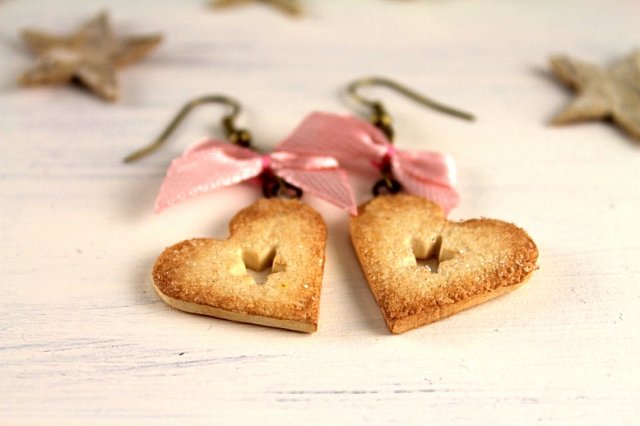 Mam do zaoferowania własnoręcznie wykonane z fimo kolczyki świąteczne ciasteczka z cukrem ozdobione kokardkami. Całość zabezpieczona werniksem.